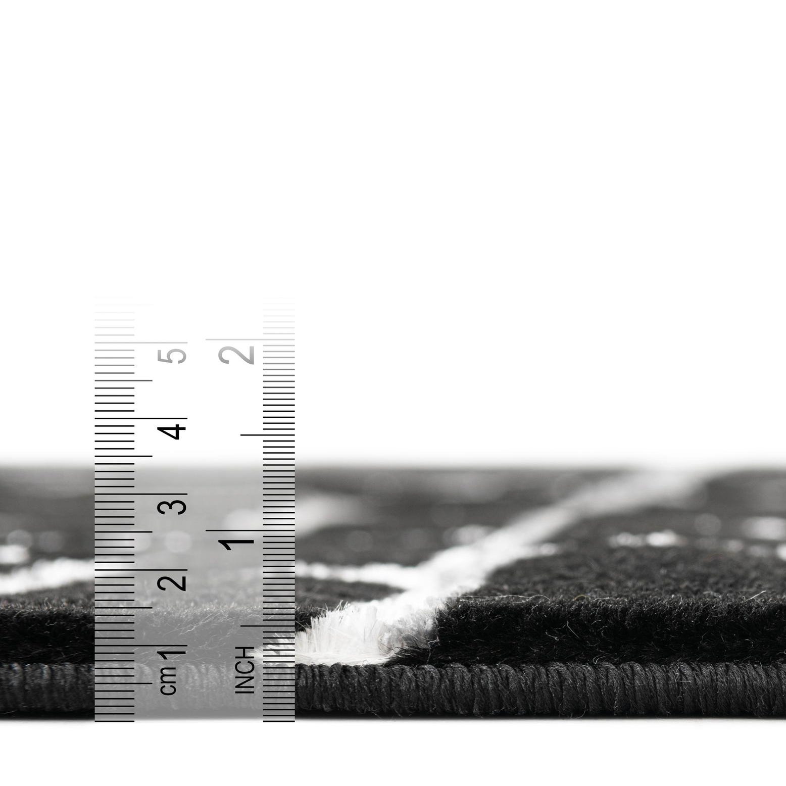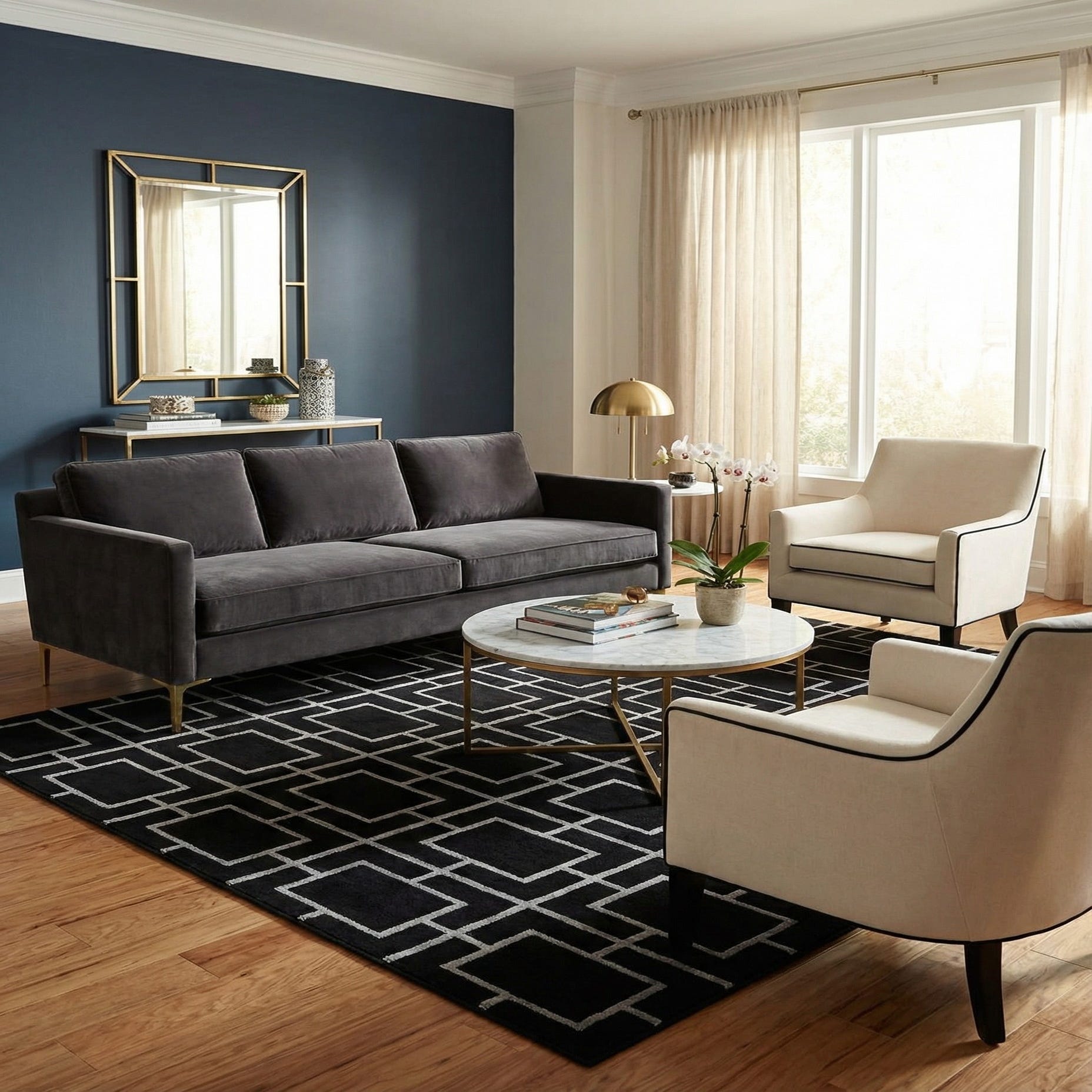 This rug works well as an anchor for contemporary living rooms, a graphic layer in a monochrome bedroom, or a statement piece in a sleek home office or entry. Pair it with chrome or mirrored accents and leather or velvet upholstery for a polished look, or let it balance warmer wood tones and jewel-toned accessories to add contrast and structure to the space.