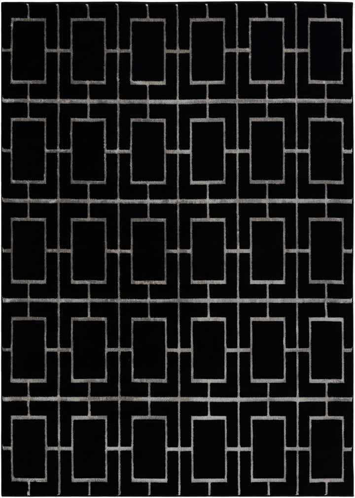 A bold geometric trellis of linked rectangles sits cleanly across a deep black field, the silver grid forming a precise, architectural pattern. The silver lines carry a subtle sheen from polyester yarn while the black background has a smooth, low-profile surface; machine-made construction of 70% polypropylene and 30% polyester creates a tactile contrast between the matte field and the slightly lustrous pattern. The design reads modern with a touch of glamour, offering crisp lines and visual rhythm that remain restrained and refined.