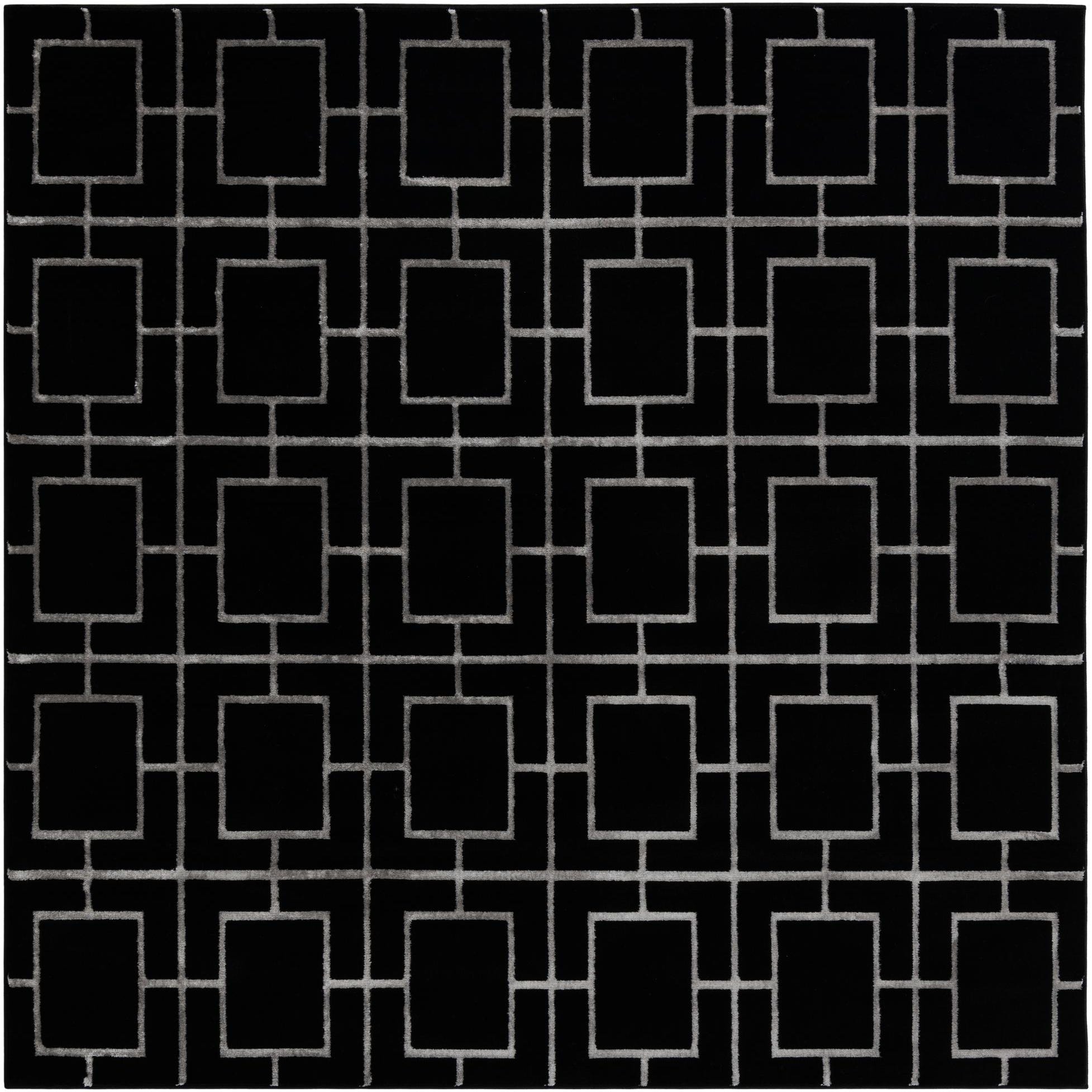 A square black and silver modern area rug featuring a repeating geometric trellis pattern, ideal for a living room.