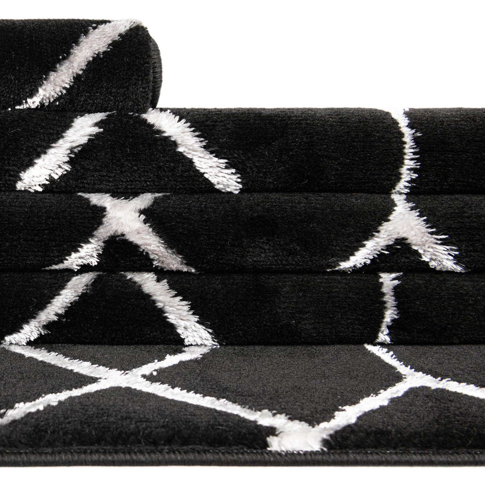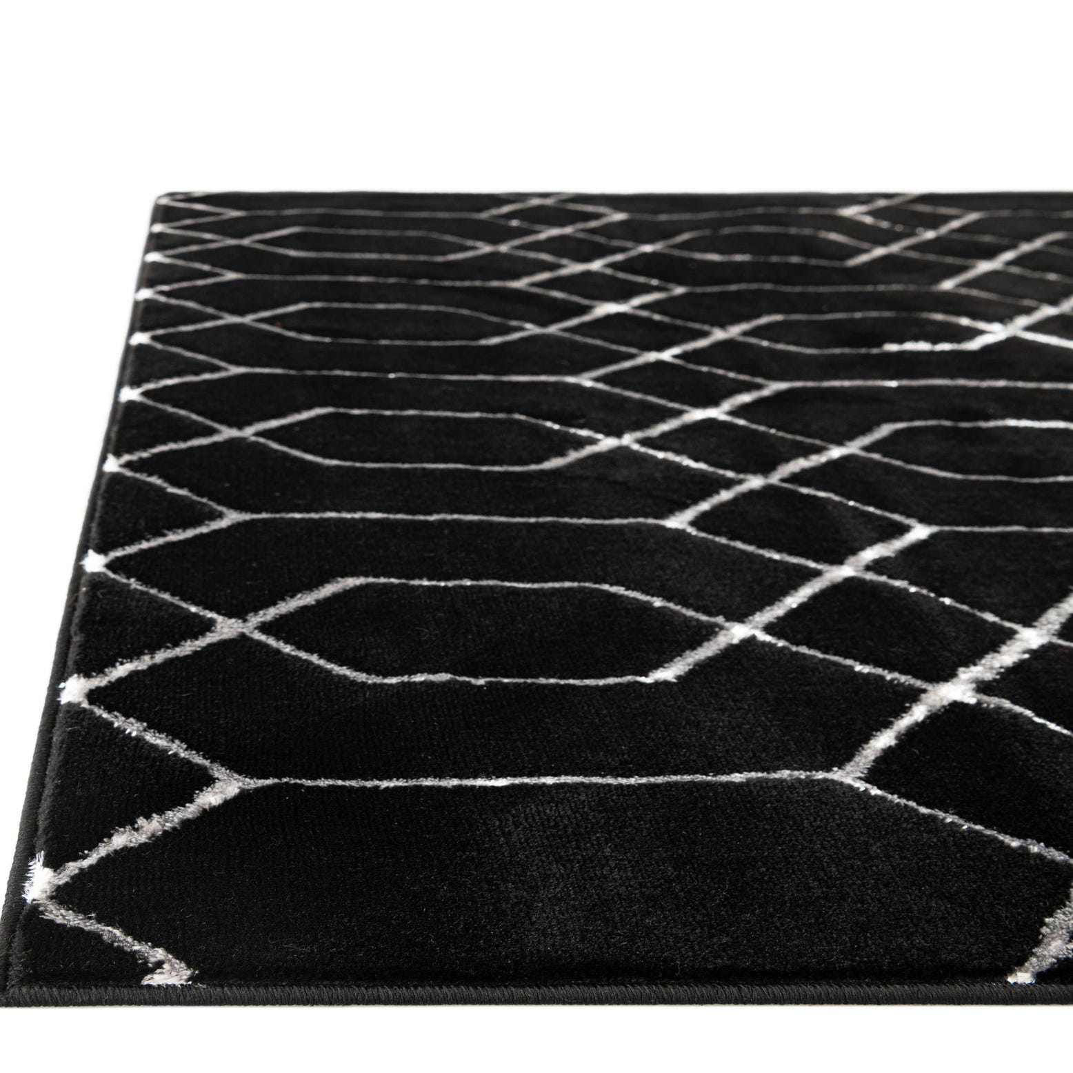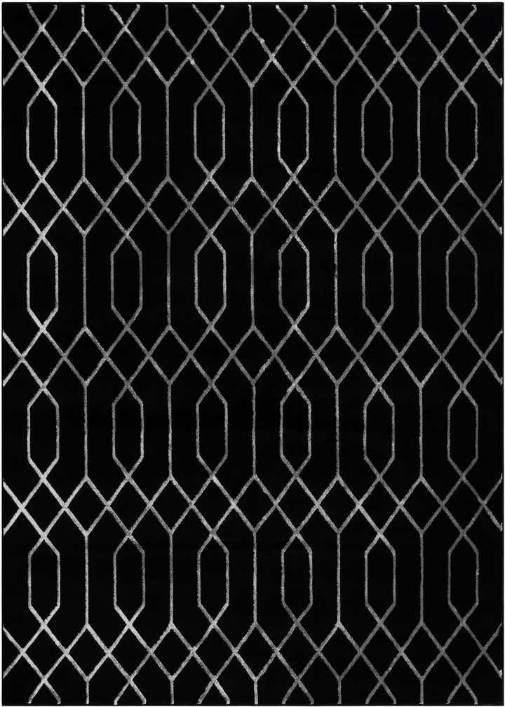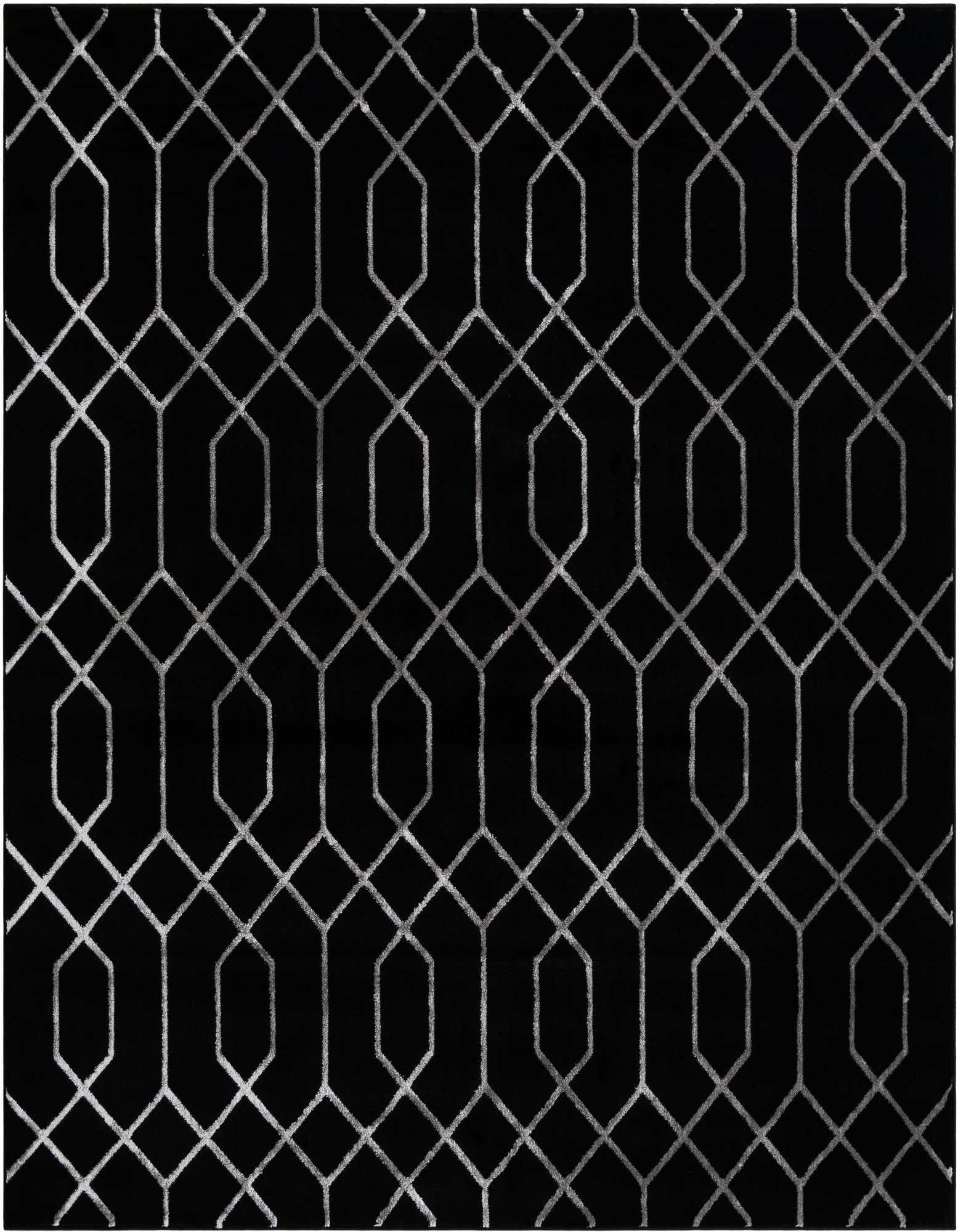 A bold, geometric trellis in shimmering silver traces a repeated elongated-hexagon motif across a deep black field, creating a crisp, graphic look with clean lines and high contrast. Machine-made from 70% polypropylene and 30% polyester, the surface has a low, dense pile with a soft, velvety hand and a slightly raised silver pattern that catches light differently as you move across it. The metallic finish of the trellis adds subtle sheen without overwhelming the overall matte backdrop, giving the rug both visual depth and gentle texture underfoot.