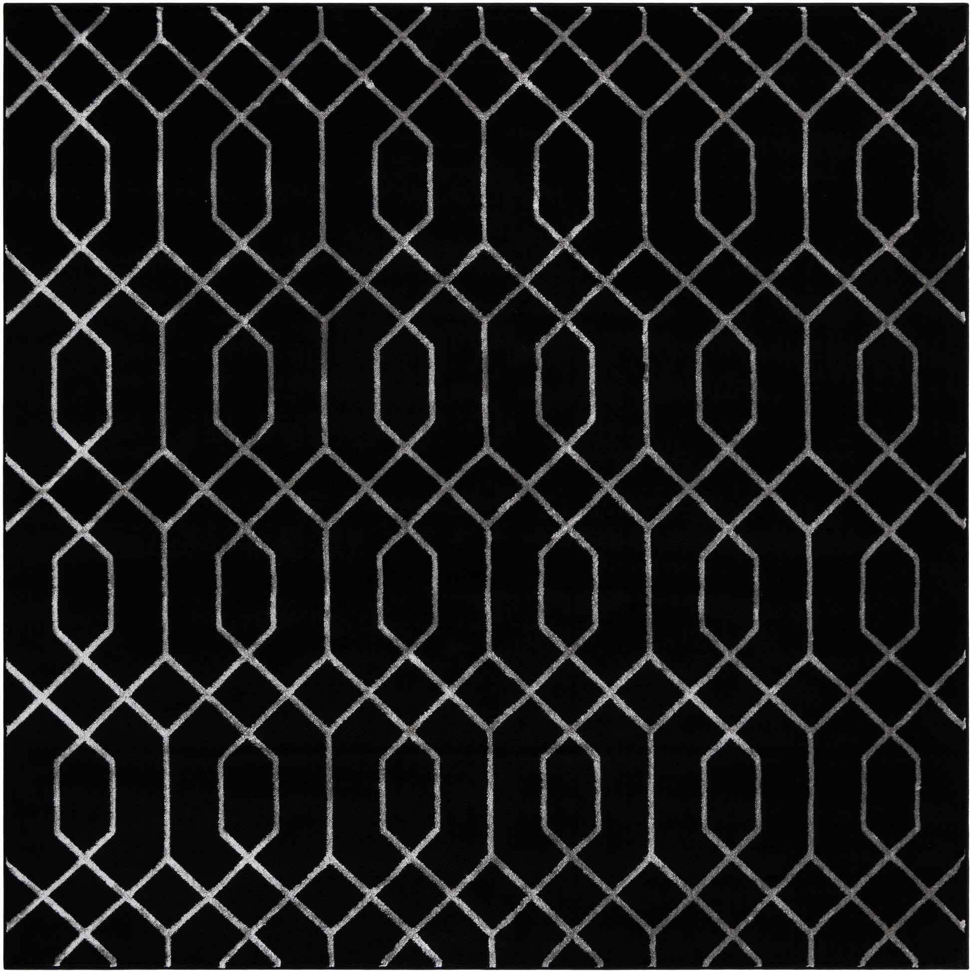 A square black rug with a silver modern geometric trellis pattern, suitable for a contemporary living room.