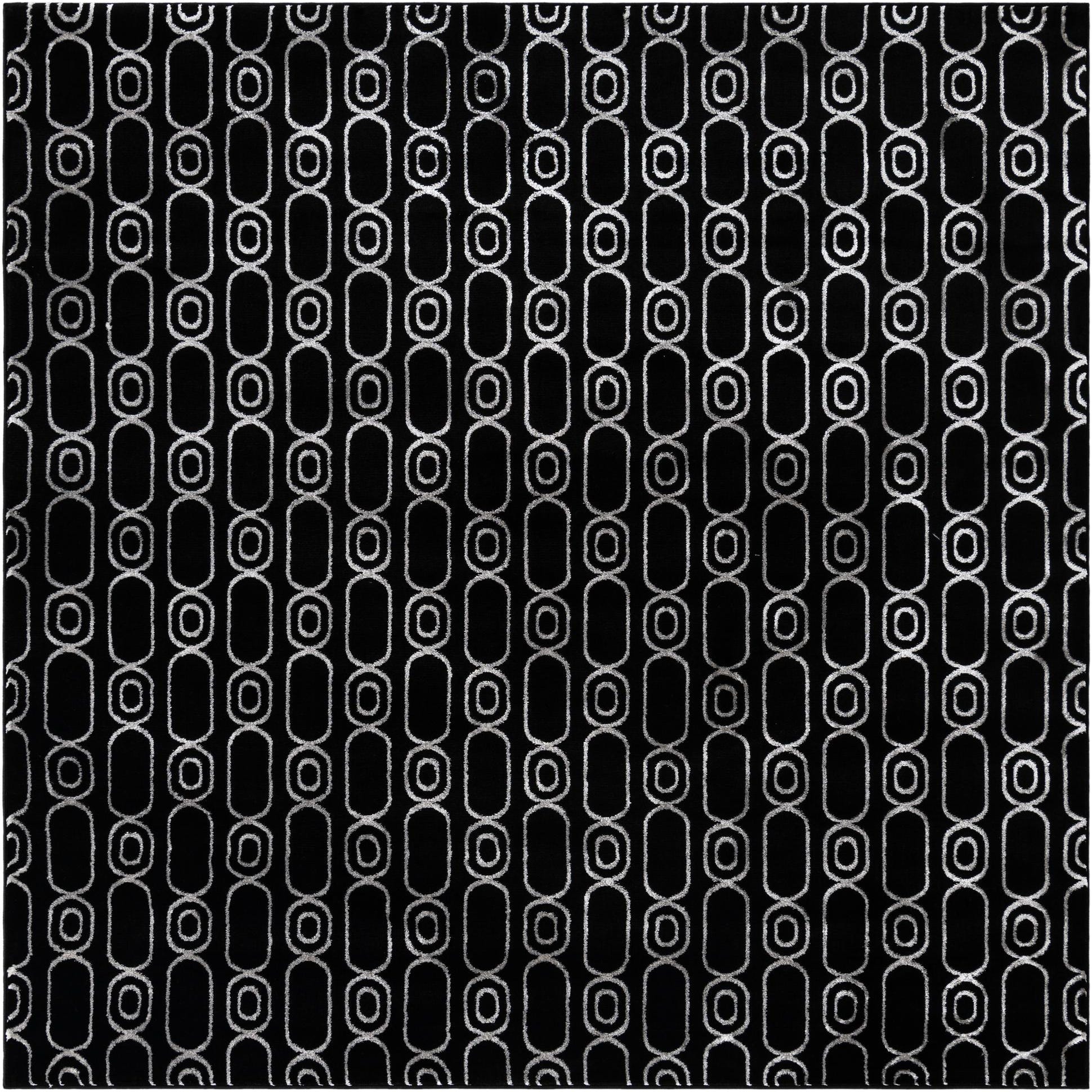 A square black and silver rug featuring a repeating pattern of interlocking oval and circular shapes, perfect for a modern living space.