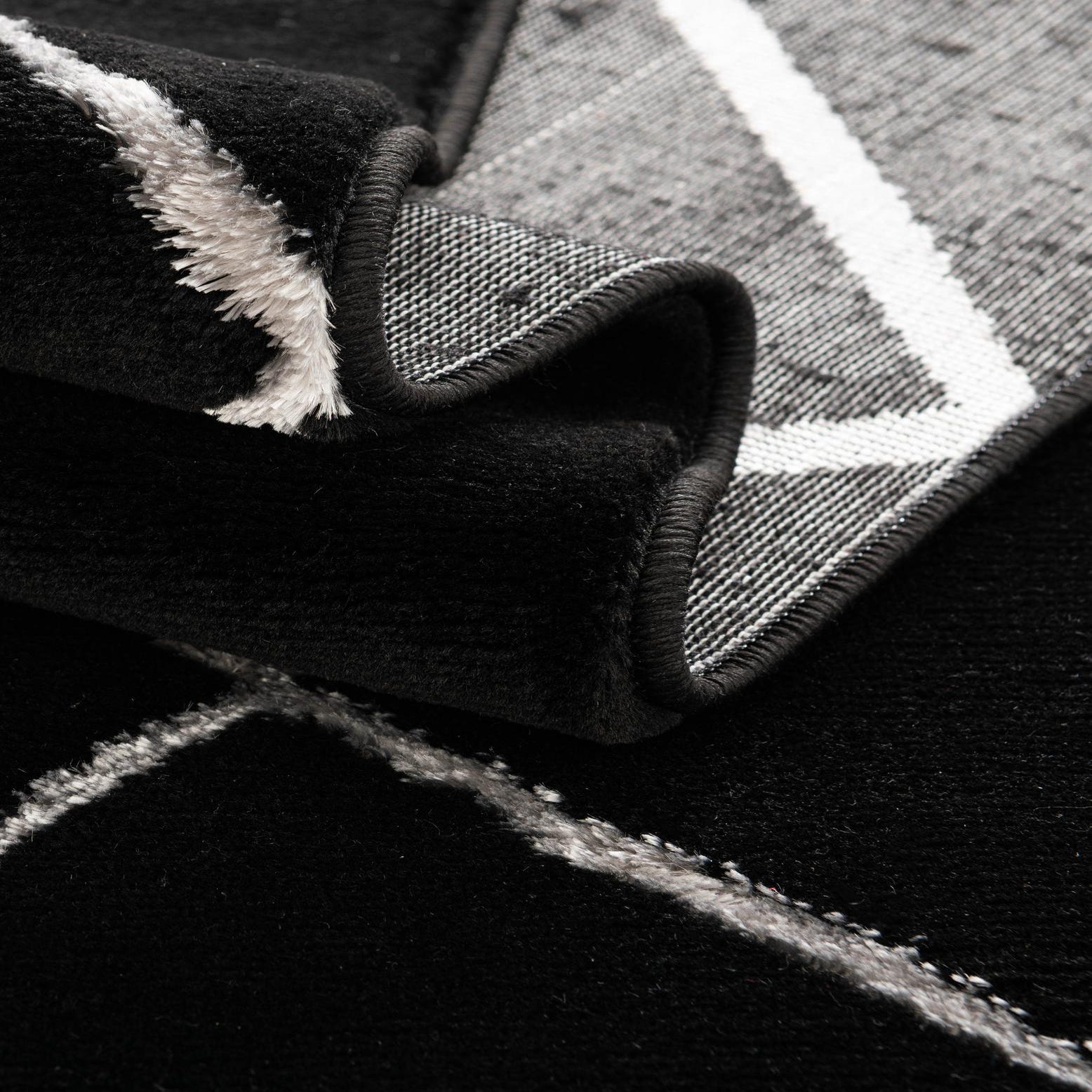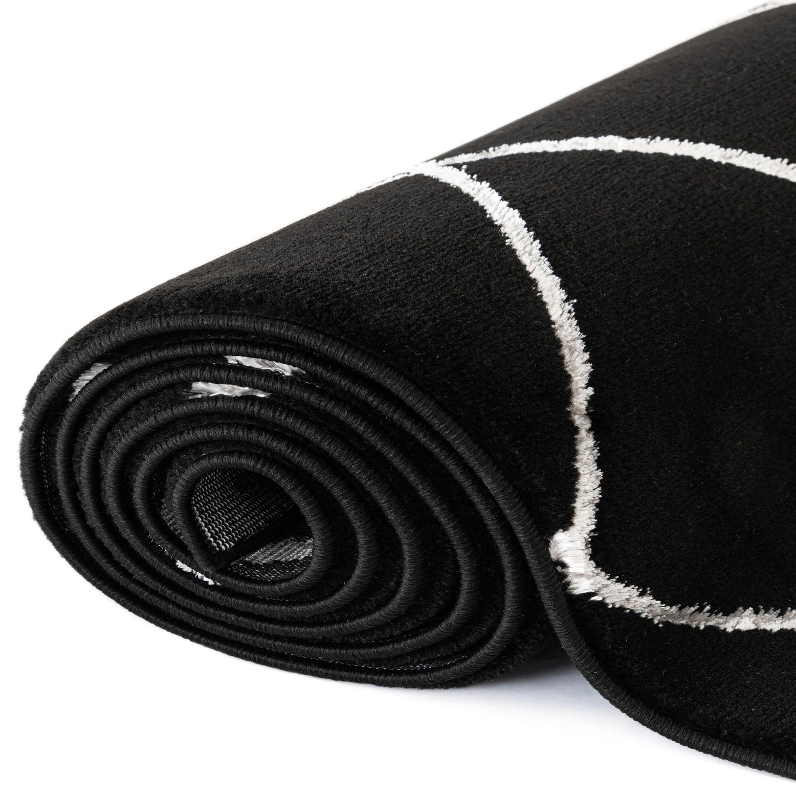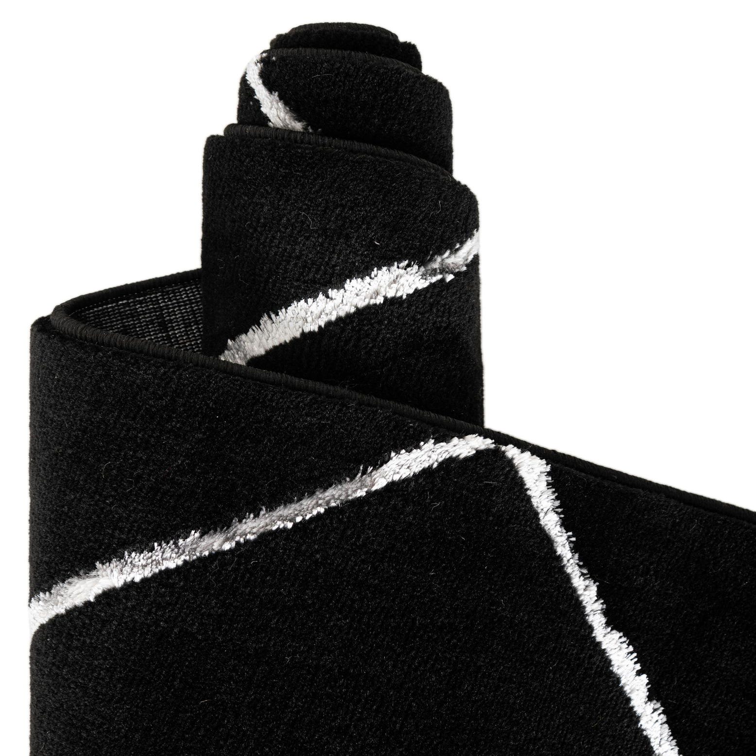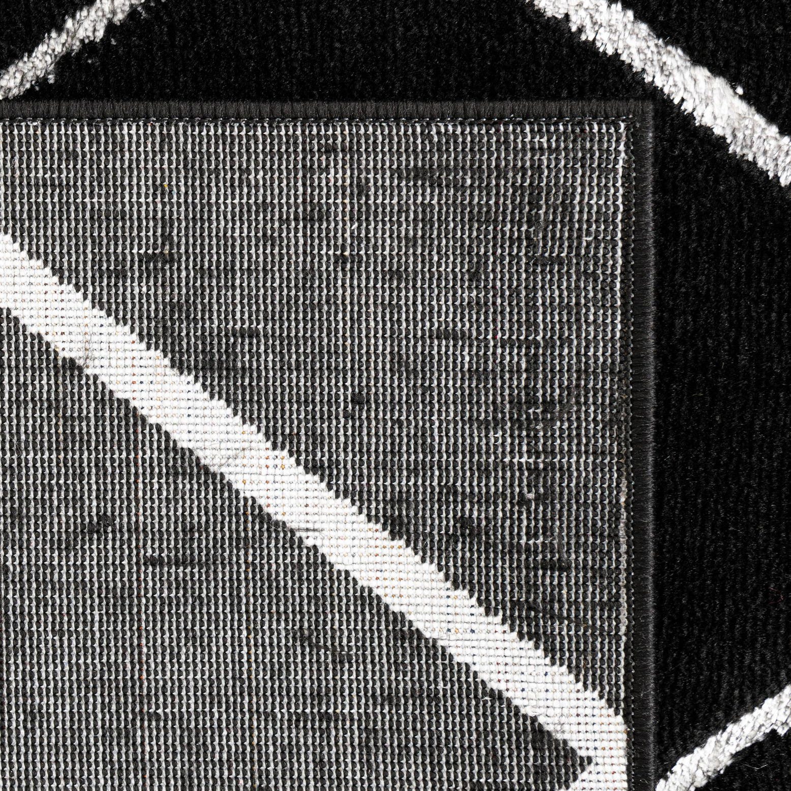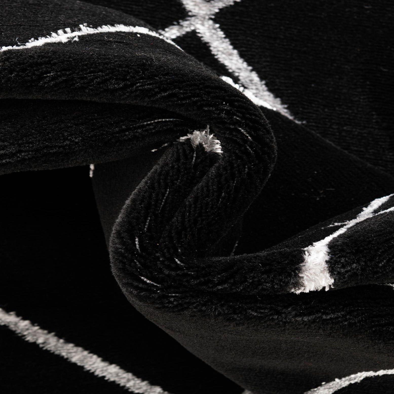 A bold diamond lattice in bright silver crosses a deep black field for a crisp, modern look. The angled grid has a slightly hand-drawn quality that softens the geometry and adds visual interest without overpowering a room. Machine-made from 70% polypropylene and 30% polyester, the rug has a low-to-medium pile that feels soft and smooth underfoot, with the silver yarns catching light for a subtle sheen against the matte black background.