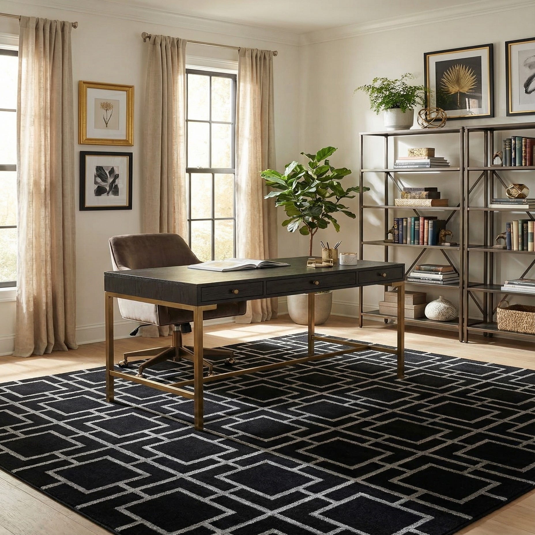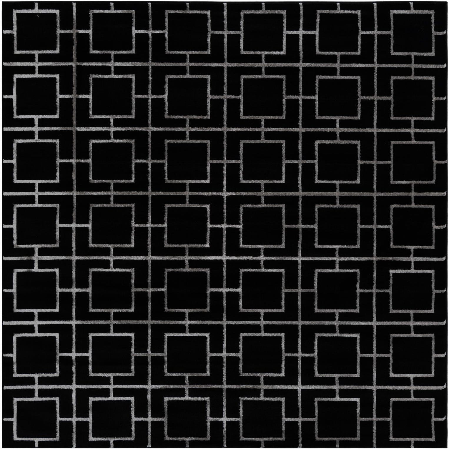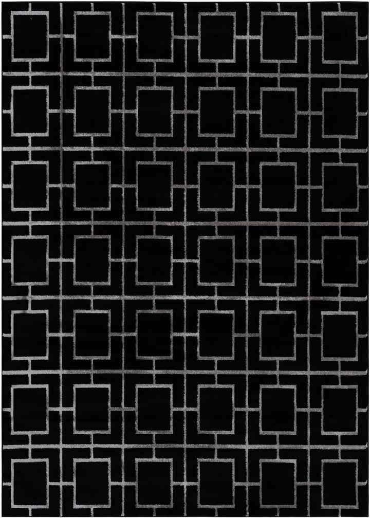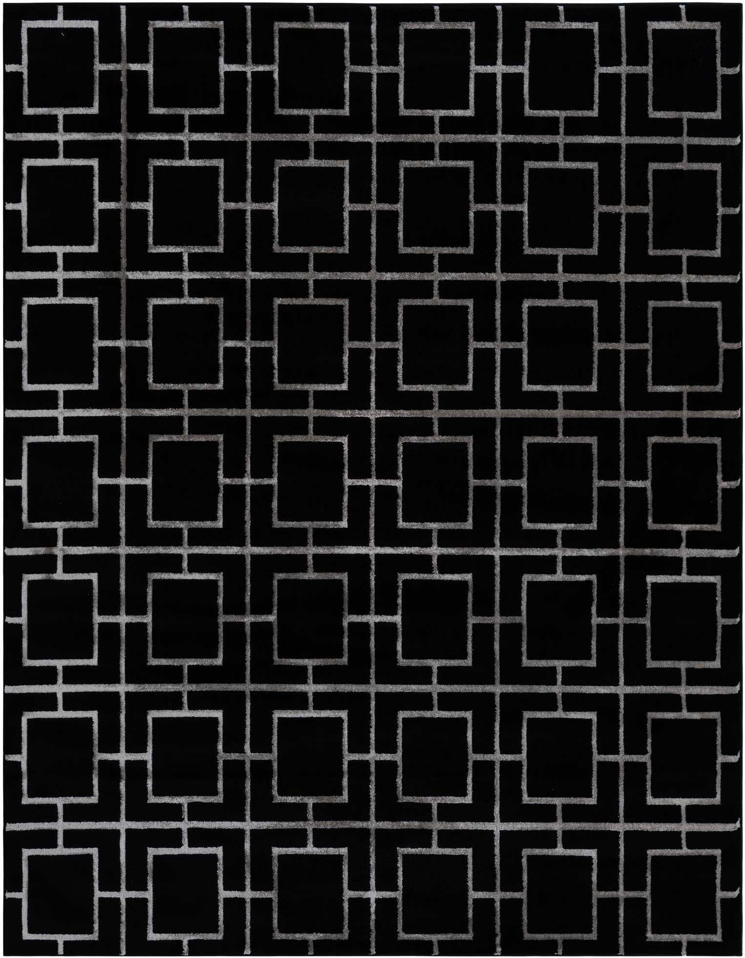 A rectangular 8x10 black and silver modern rug featuring a bold geometric trellis pattern.