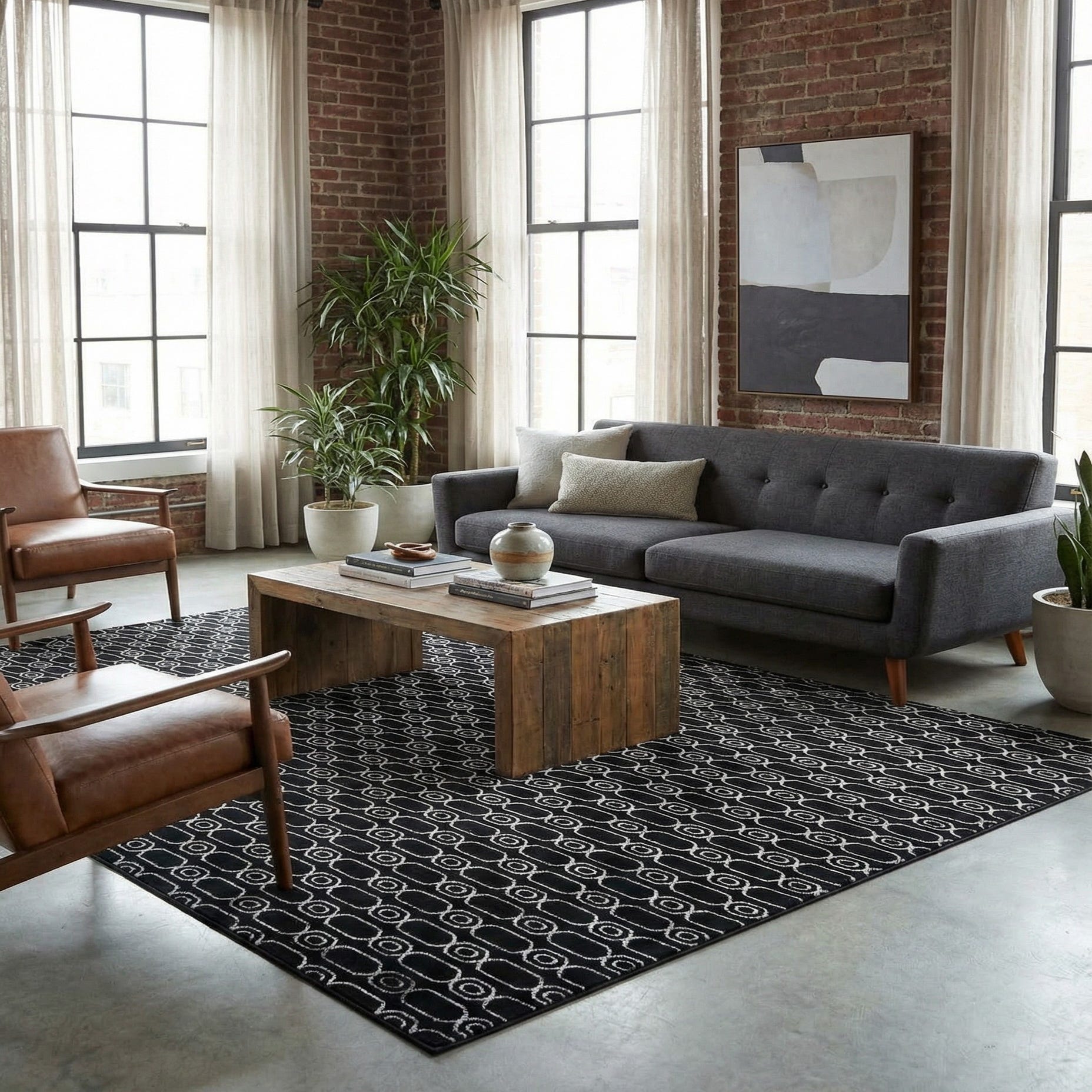 This rug fits well in contemporary and mid-century modern interiors where graphic contrast is welcome — place it under a living room seating group to anchor a sofa and coffee table, beneath a dining table to introduce pattern without overwhelming, or in a home office for a polished, professional look. It pairs nicely with black or chrome metal accents, glass-top tables, leather seating, and warm wood tones to balance the monochrome palette.