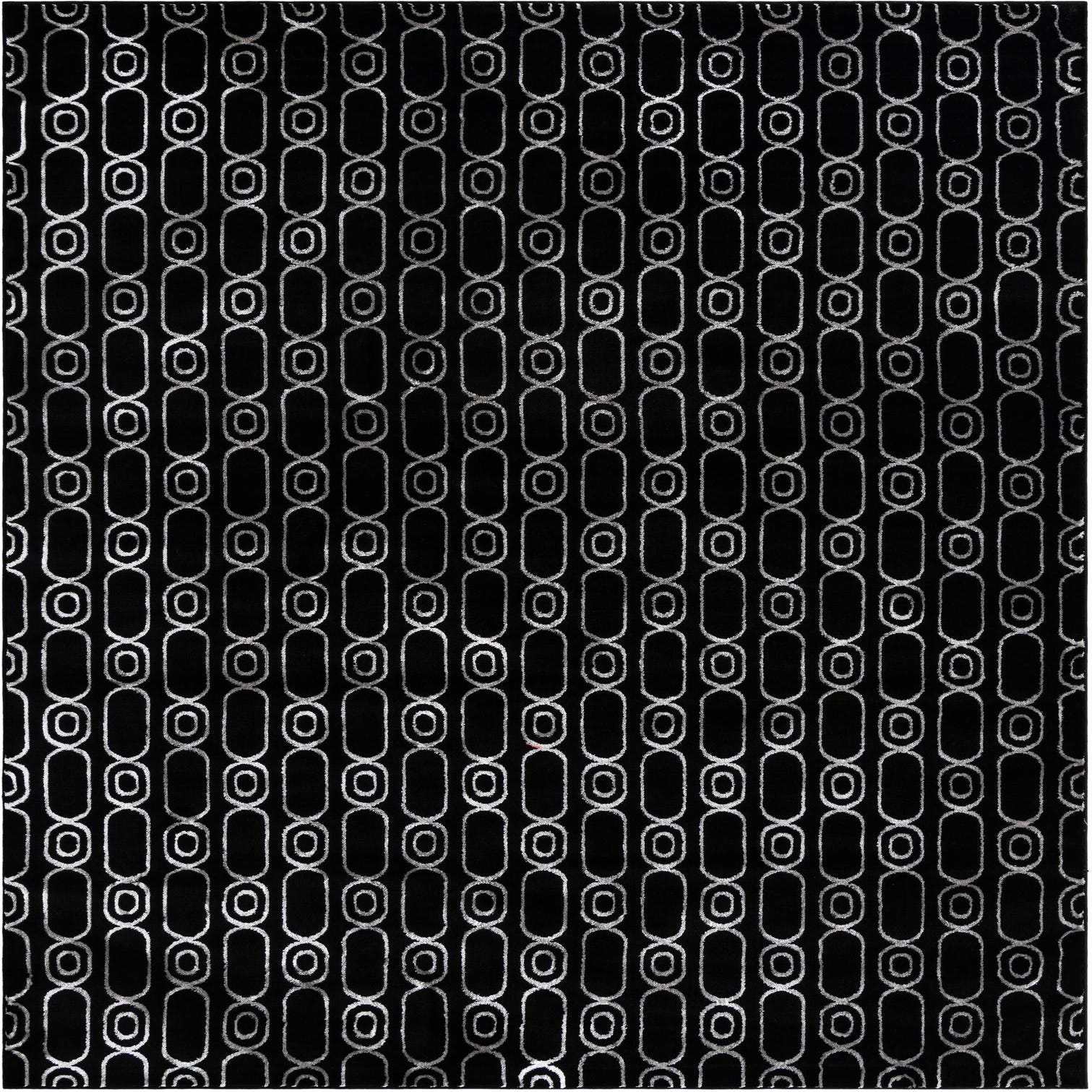 A rectangular 8x10 black and silver area rug featuring a repeating geometric pattern of interconnected ovals and circles.