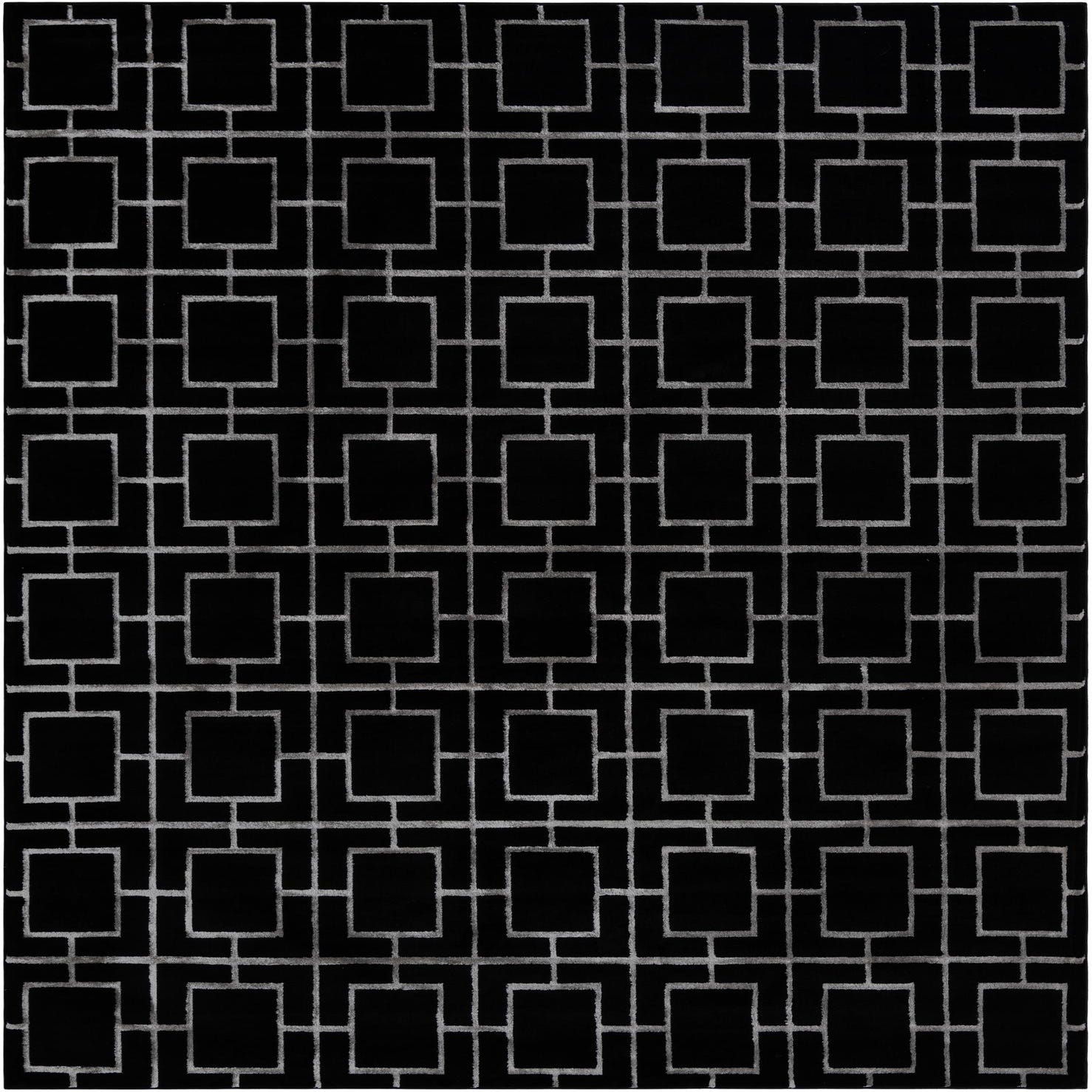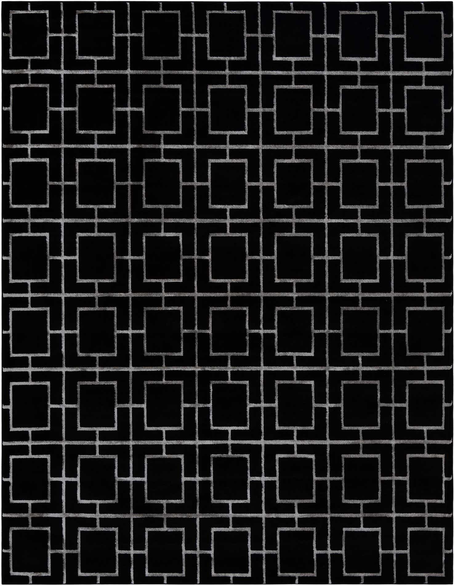 A 9x12 rectangular black and silver modern area rug with a repeating geometric trellis pattern.