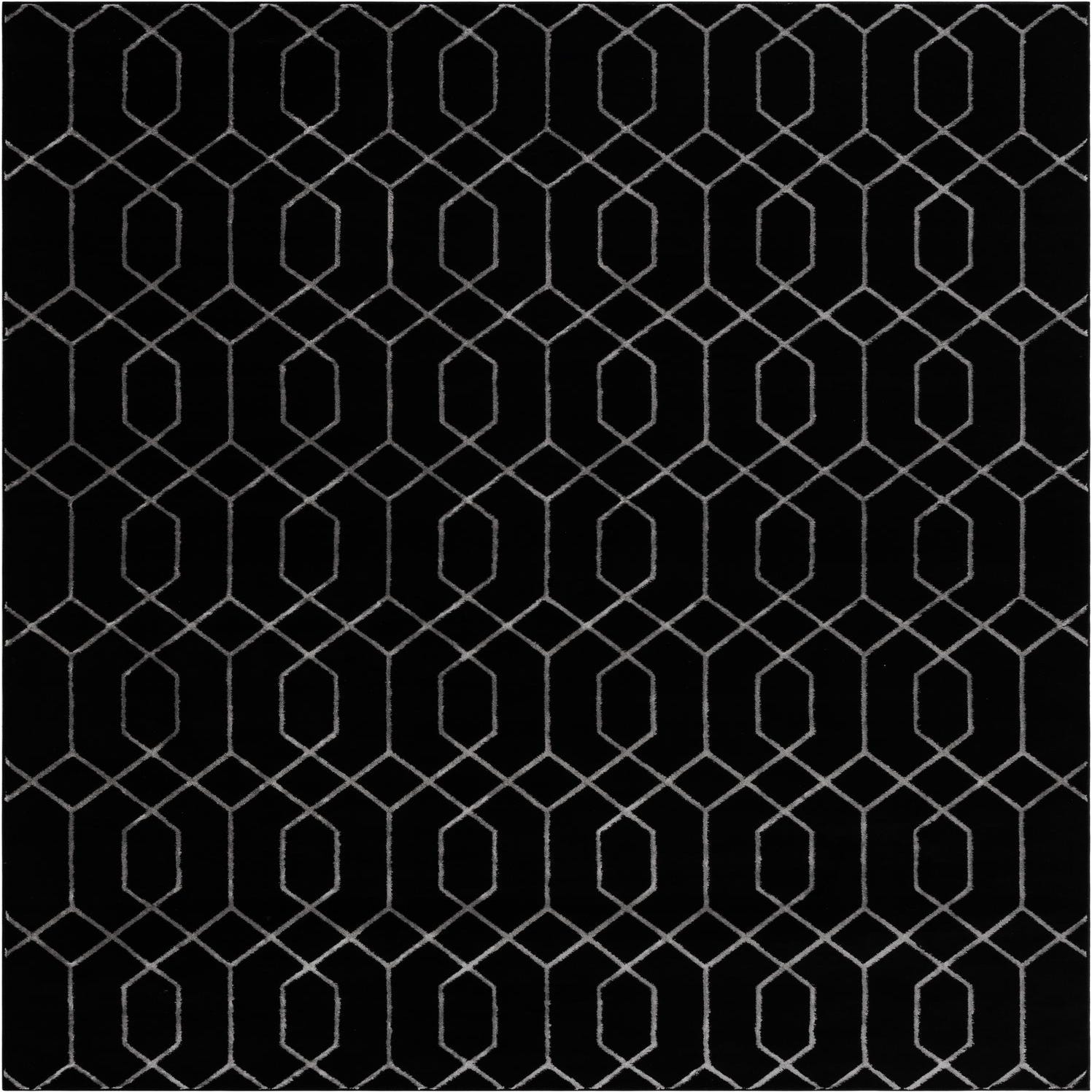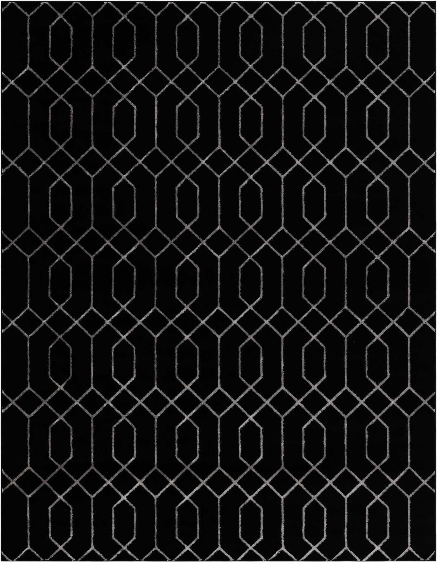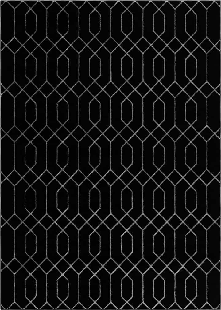 A graphic trellis pattern of elongated octagons and diamond links runs across a deep black field, the silver lines offering crisp contrast and a modern, architectural feel. The geometric motif reads clean and refined, with the silver threads catching light to add subtle dimension without overpowering a room. The surface is low-pile and smooth to the touch; machine-made from 70% polypropylene and 30% polyester, the construction provides a soft hand with a slight sheen where the polyester fibers sit against the polypropylene ground.