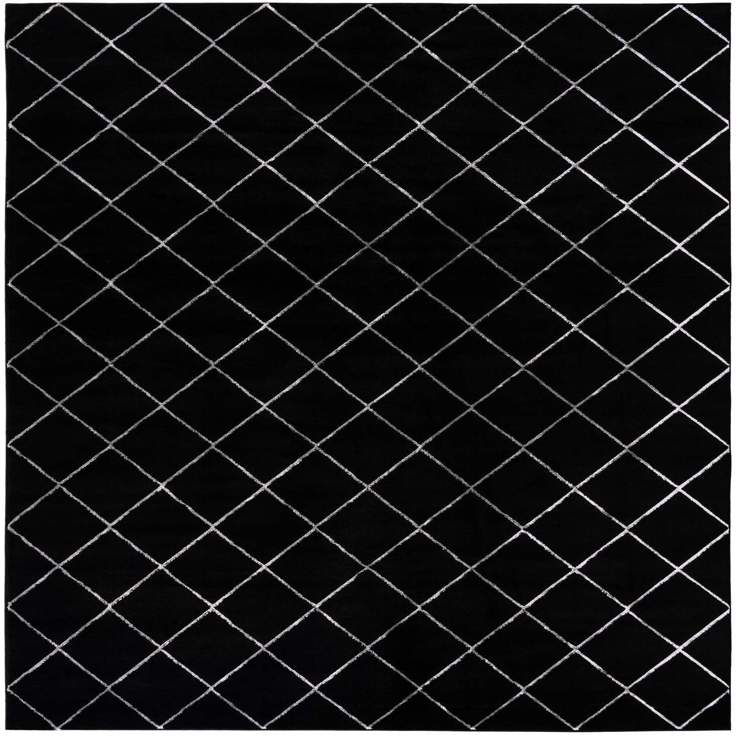 A clean, geometric lattice runs across a deep black field, the silver lines forming a classic diamond trellis that gives the rug a modern yet timeless feel. Machine made from 70% polypropylene and 30% polyester, the surface has a soft, low-pile hand with a subtle sheen where the silver yarn catches light, creating gentle contrast without overwhelming the room. The crisp pattern and two-tone palette make the design easy to layer with both bold and restrained furnishings.