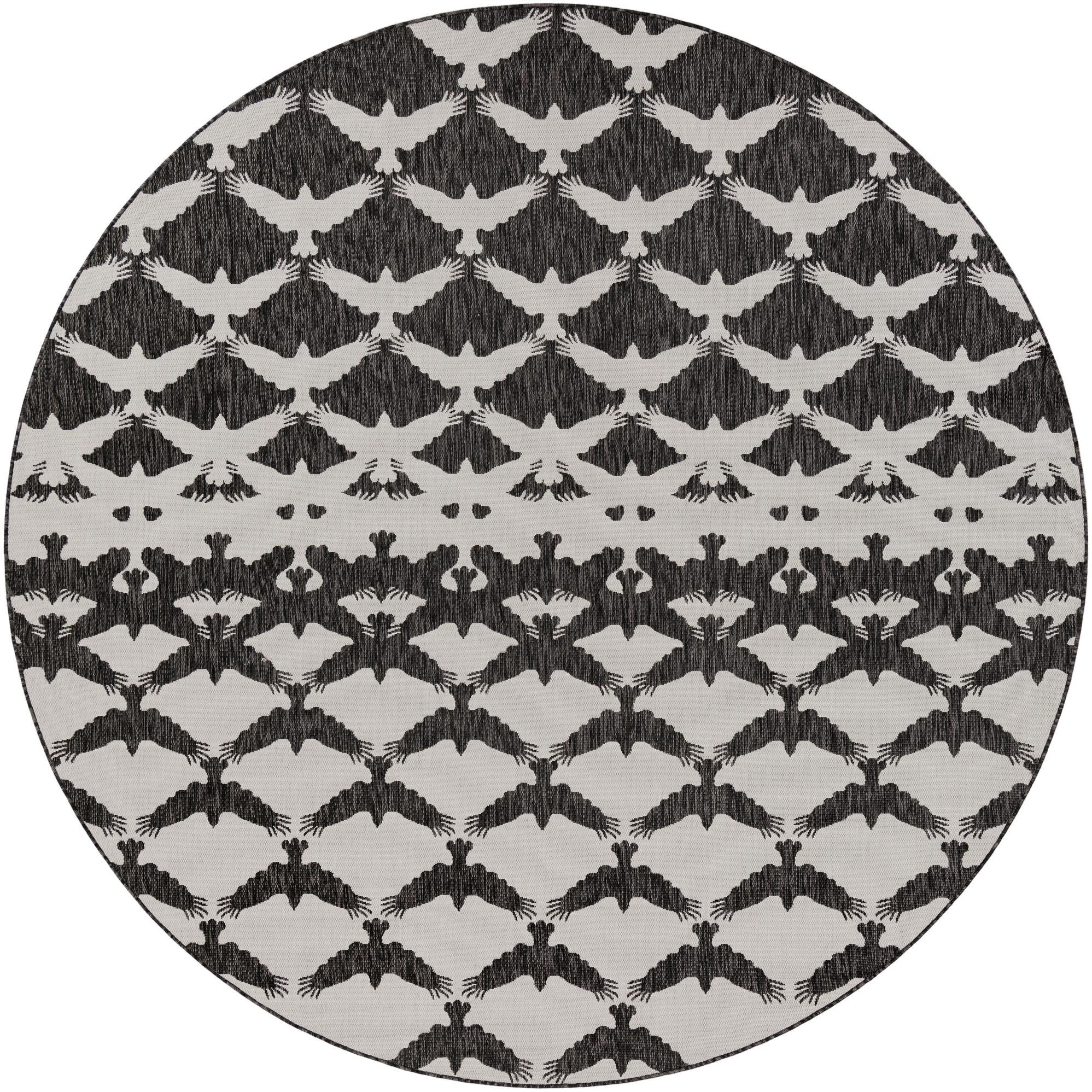 A 10' round black and white modern rug featuring a repeating pattern of flying bird silhouettes.