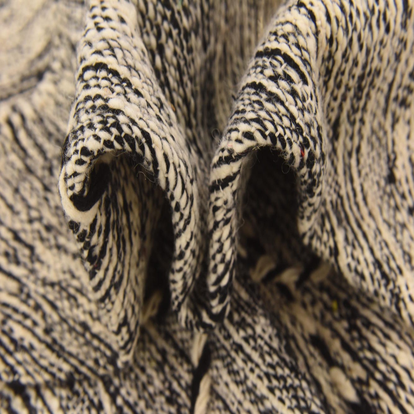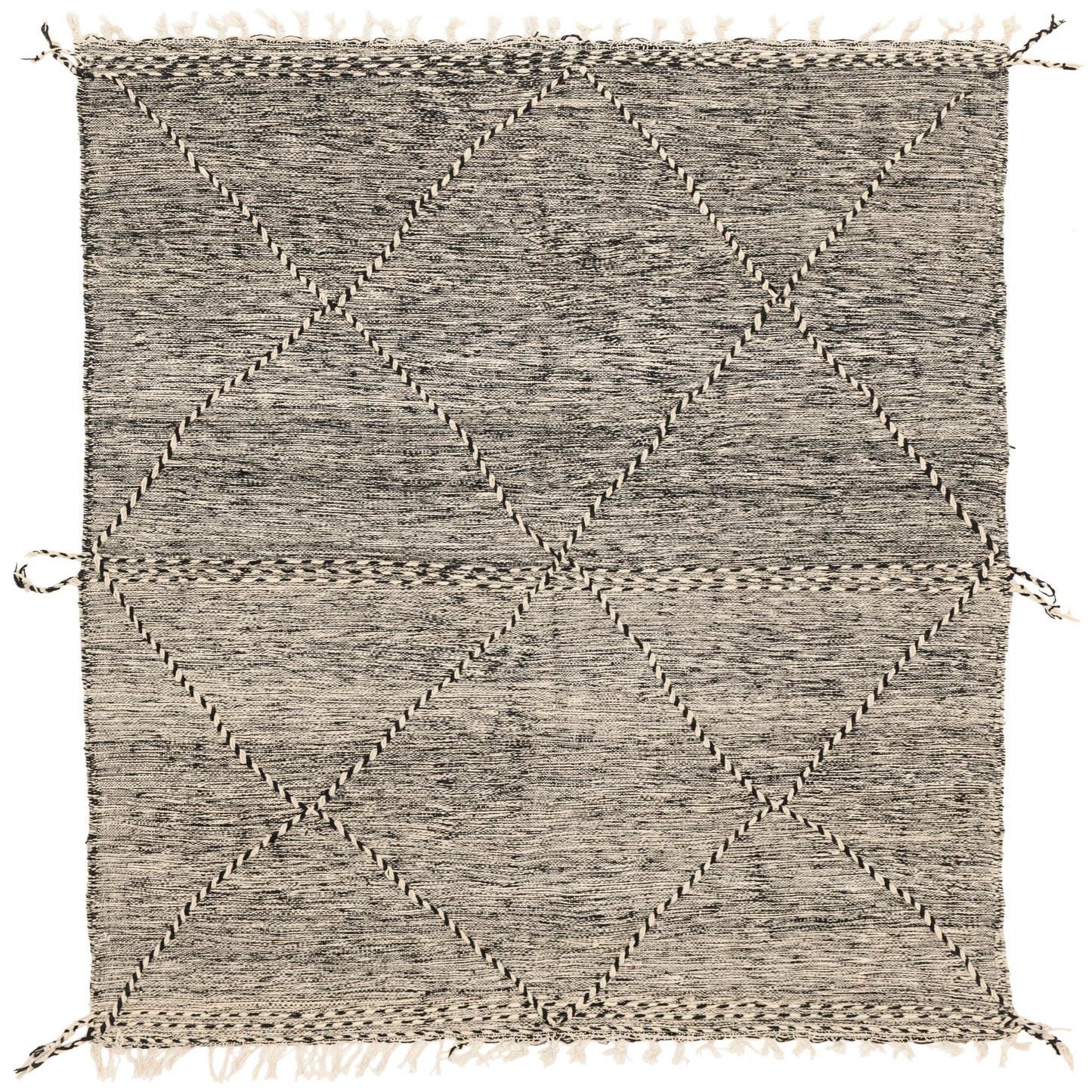 Hand-knotted from 100% wool, this runner presents a marled black-and-white ground with a low, tactile pile that feels warm and slightly nubby underfoot. Thick braided cords create an oversized diamond lattice across the field, punctuated by narrow woven bands and finished with fringed ends and braided corner ties. The contrast of black and white keeps the pattern graphic without overpowering a space.
