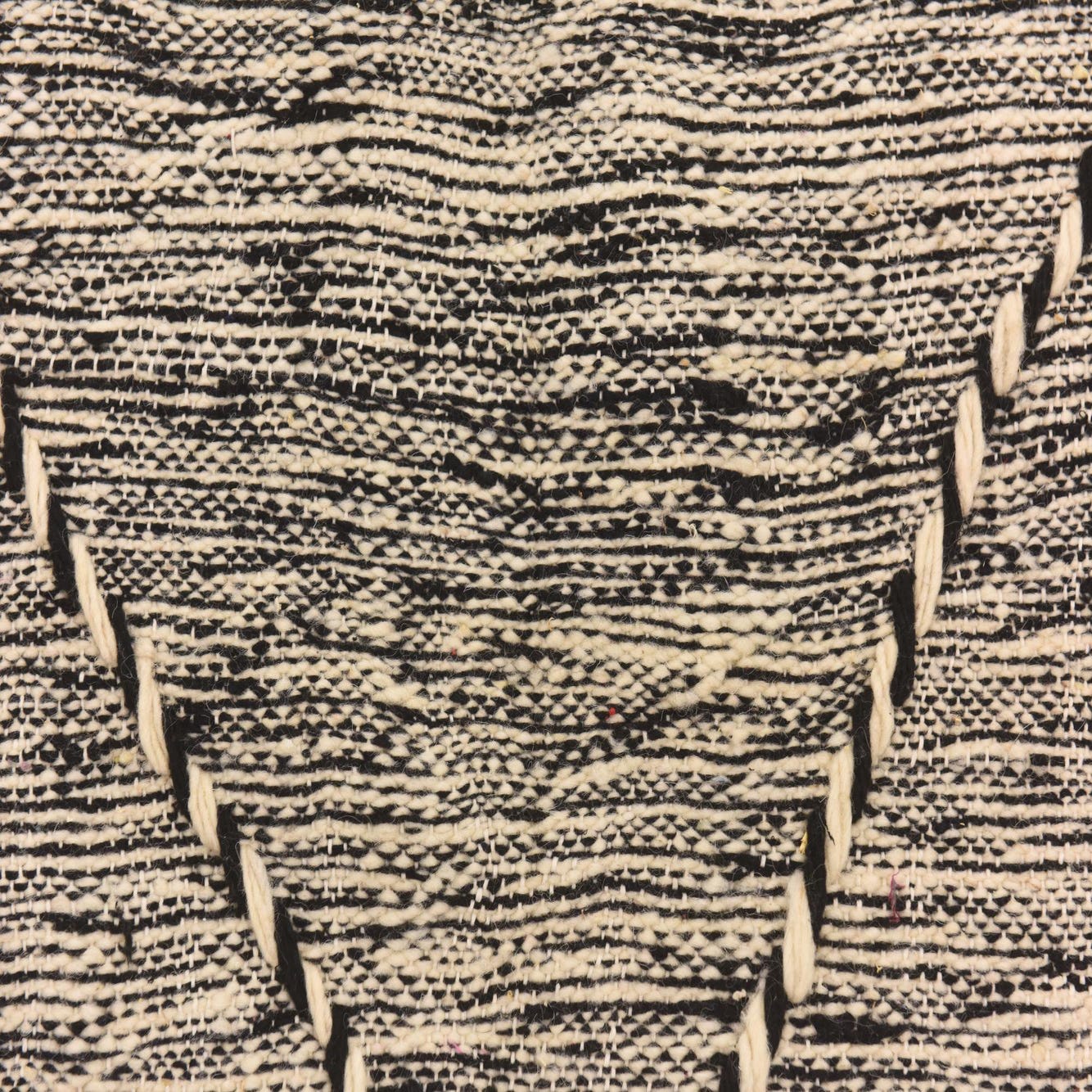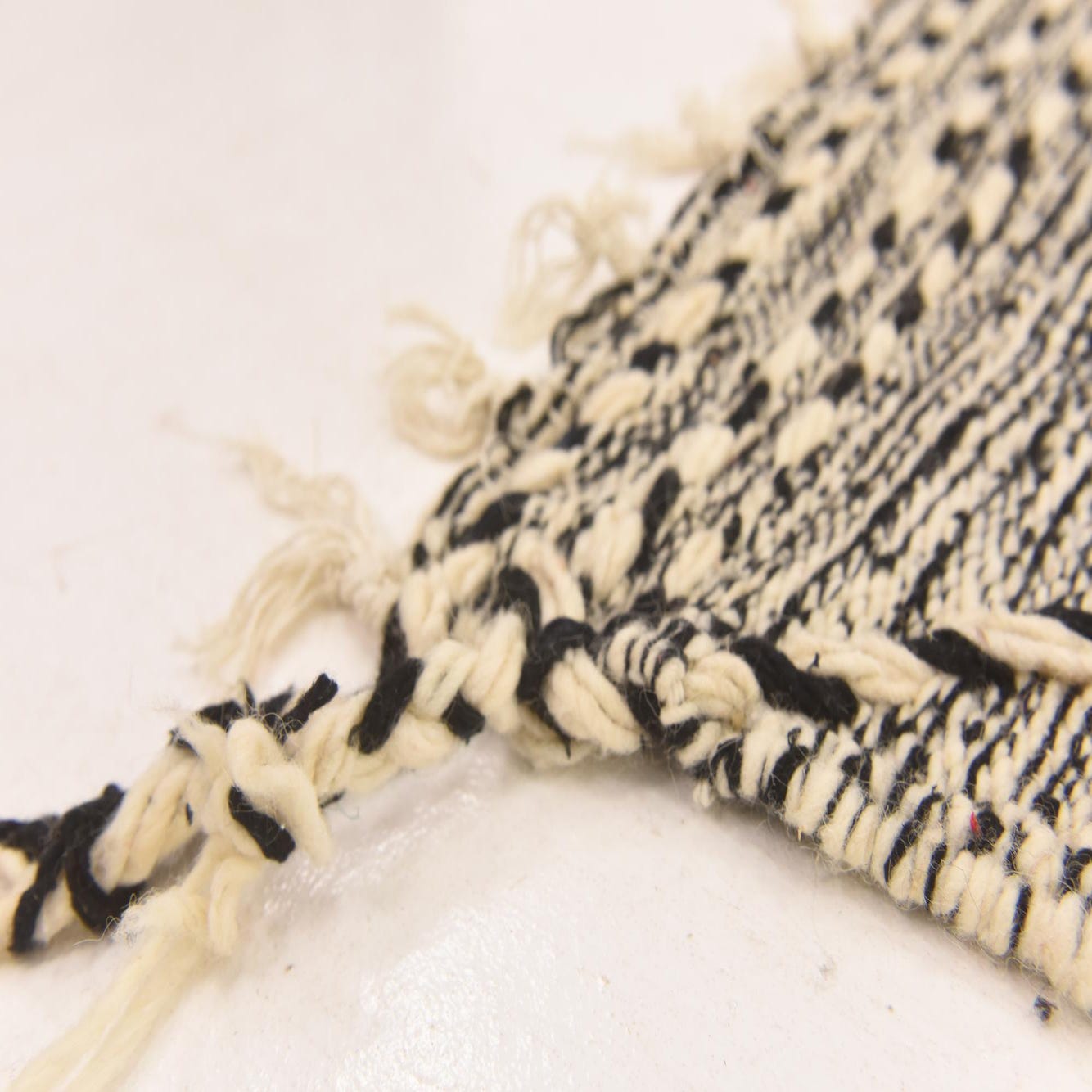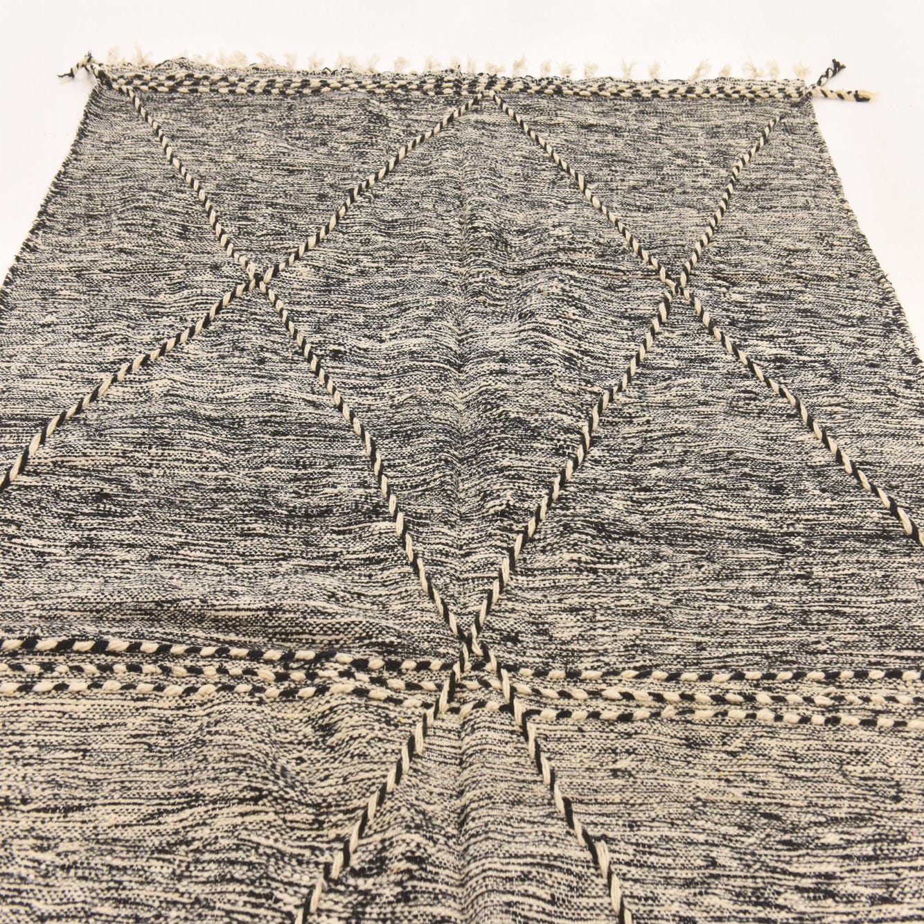 A 10 ft runner rug in black and ivory, featuring a tribal geometric diamond pattern and decorative tassels.