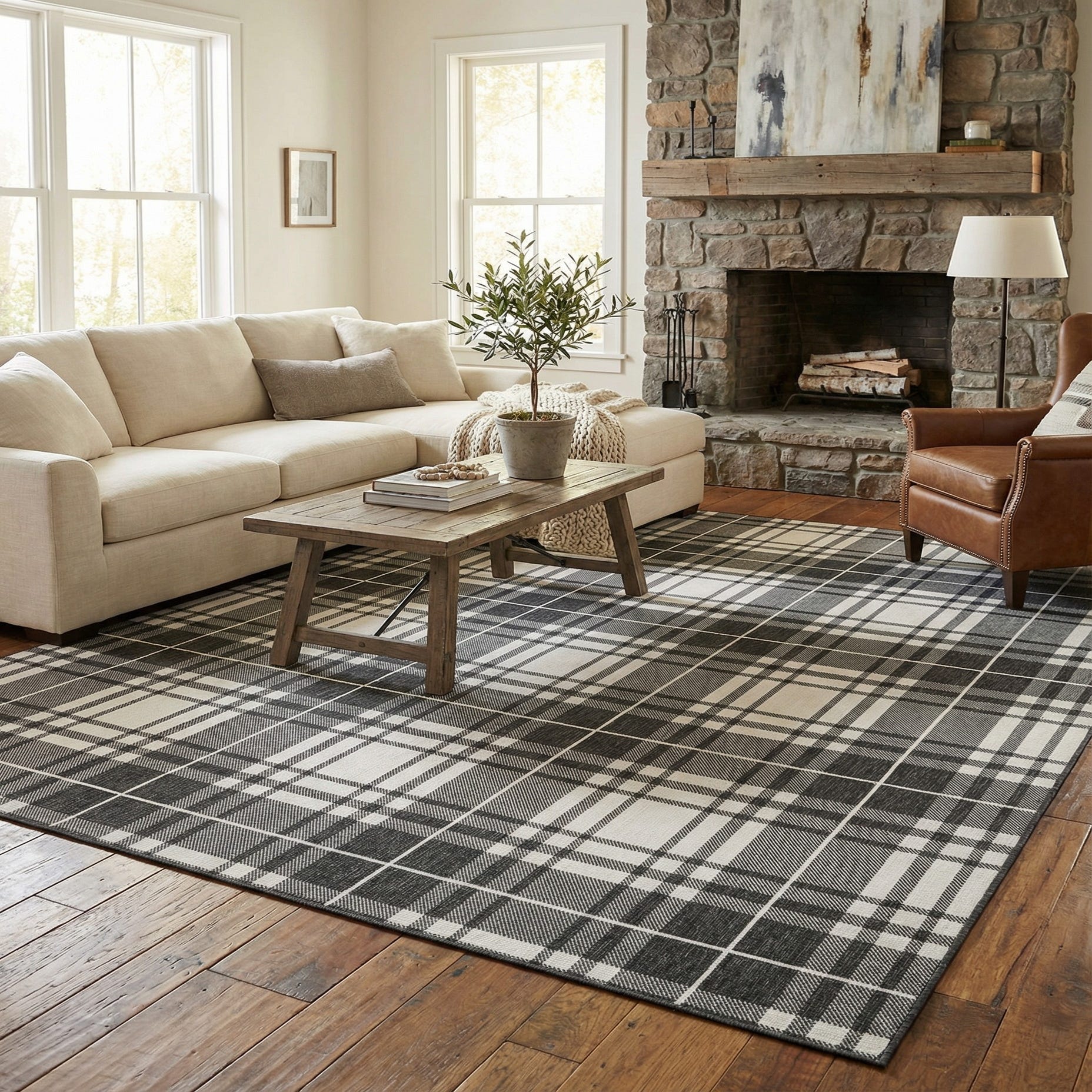 Well-suited to outdoor living areas and covered patios, the rug also anchors indoor spaces such as a modern farmhouse living room, a monochrome home office, or an entryway with clean, contemporary furnishings. Pair it with natural rattan seating and neutral cushions for a relaxed outdoor vibe, tuck it beneath a sleek dining set to add visual structure, or use it to ground leather or white-painted furniture for a balanced, layered composition.