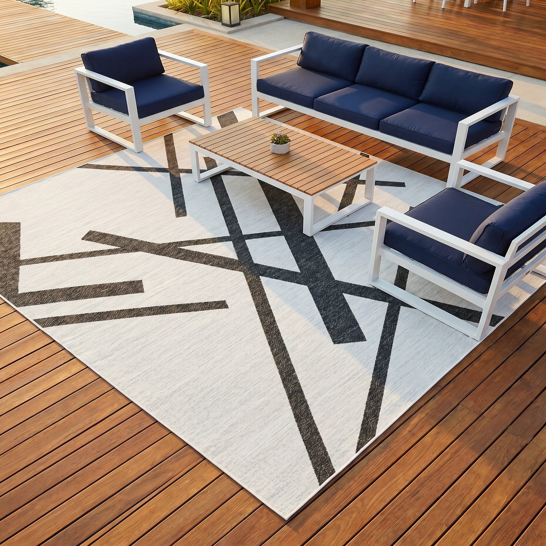Love the contemporary look of this rug! We are so happy we chose this to accent the blue of our pool with our living area on our lanai. We still are going to add a few more pillows but love the rug to add color.