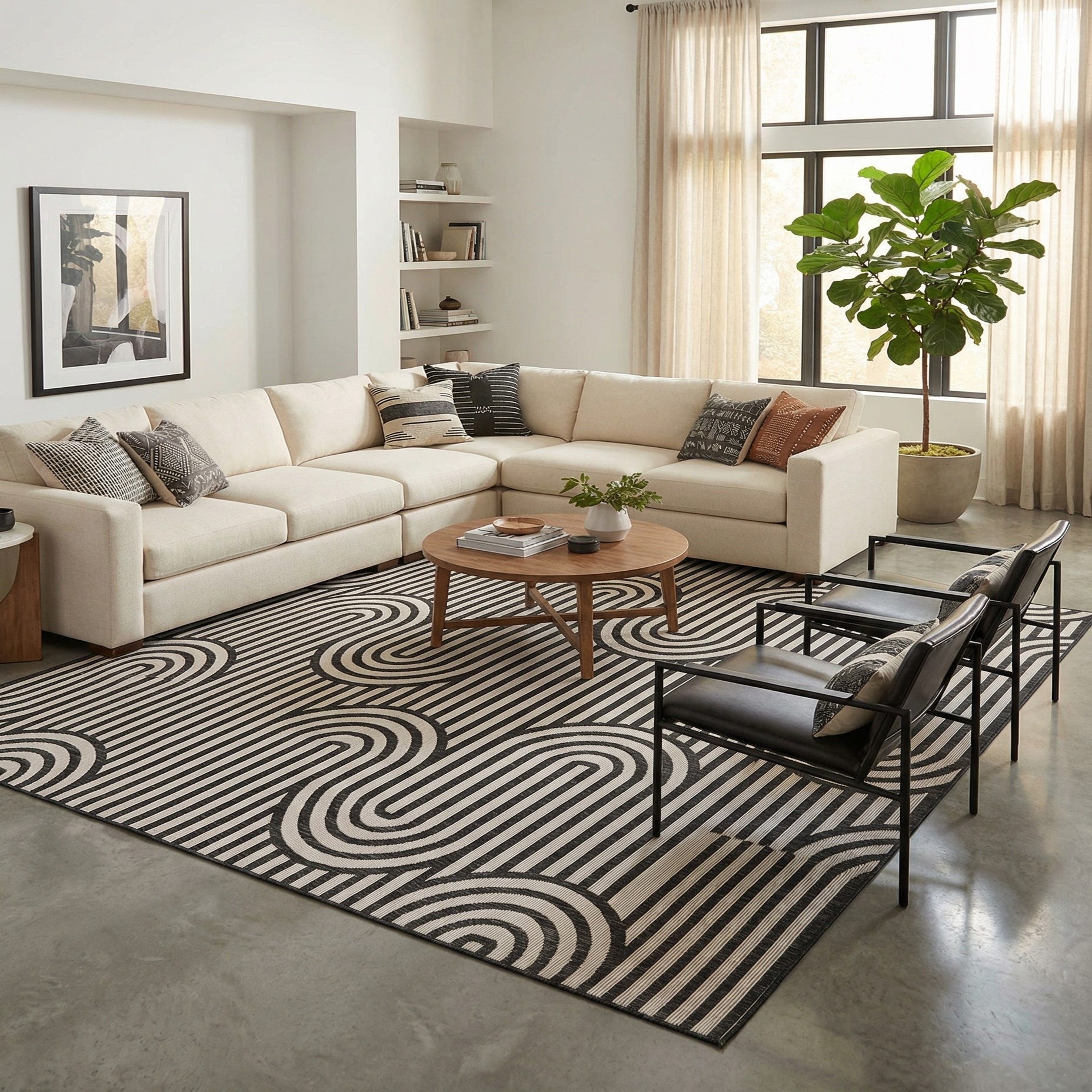 The flatweave construction contributes to the rug's low profile and ease of maintenance, making it an ideal choice for outdoor settings where furniture is often moved around. This black and white color scheme allows for versatility in design, seamlessly integrating with a multitude of decor styles from minimalist to modern, and even complementing bolder, more eclectic interiors with its striking pattern.