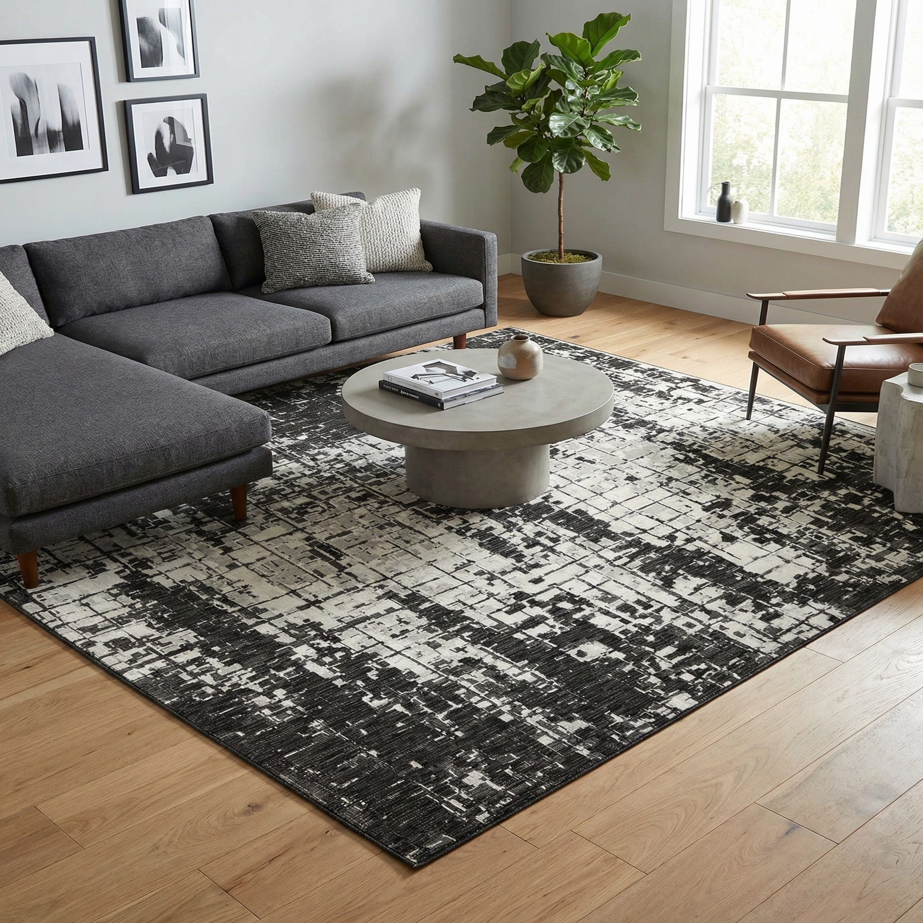 A 10'x10' square black and white abstract rug with a distressed grid pattern, suitable for a modern patio.