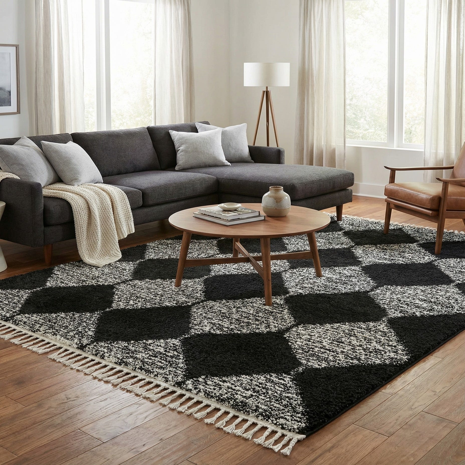 A close-up of a black and white square shag rug with a modern trellis pattern, featuring large black diamond shapes against a textured ivory background, with visible fringe.