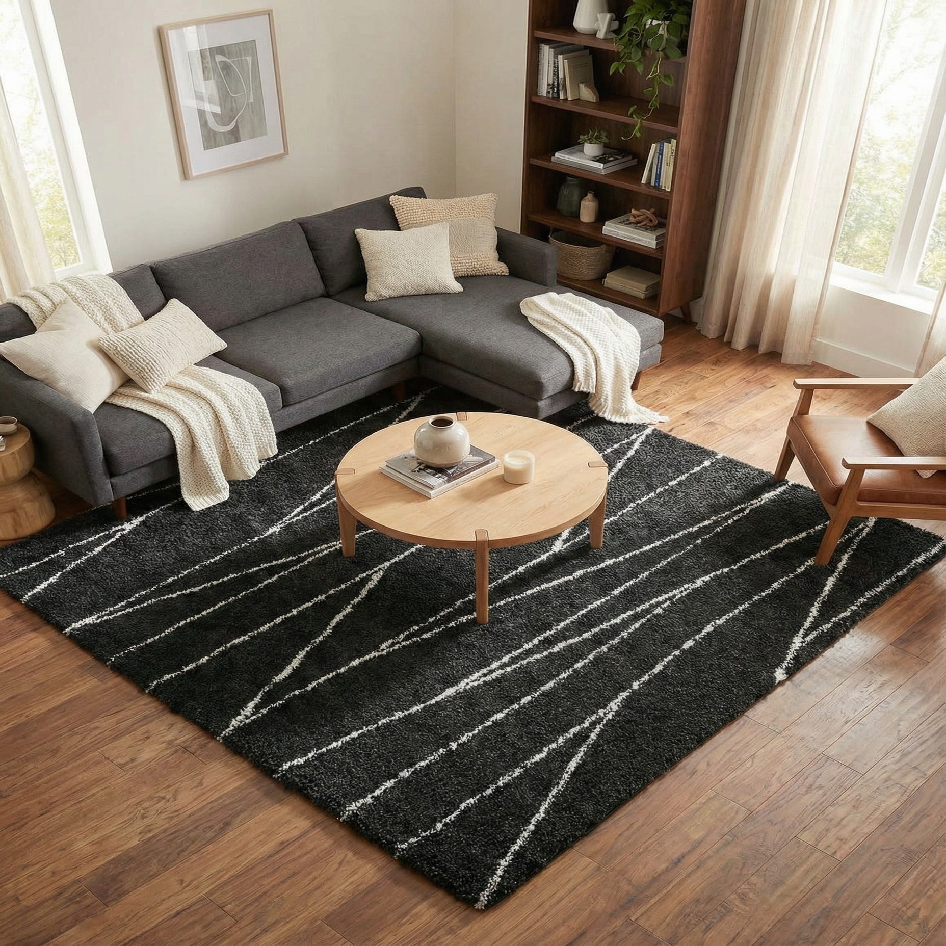 This piece is versatile in its application and would complement a variety of interior design scenarios. It would serve as a striking contrast in a minimalist or modern setting, where its bold pattern could be a focal point within a neutral color palette. Alternatively, the rug can integrate seamlessly into a more eclectic or bohemian space, where its texture and fringe detailing would harmonize with a mix of patterns and decor. The Serenity Shag rug is a practical and stylish choice for adding definition and comfort to a living room, home office, or larger open spaces that are in need of a distinctive visual anchor.