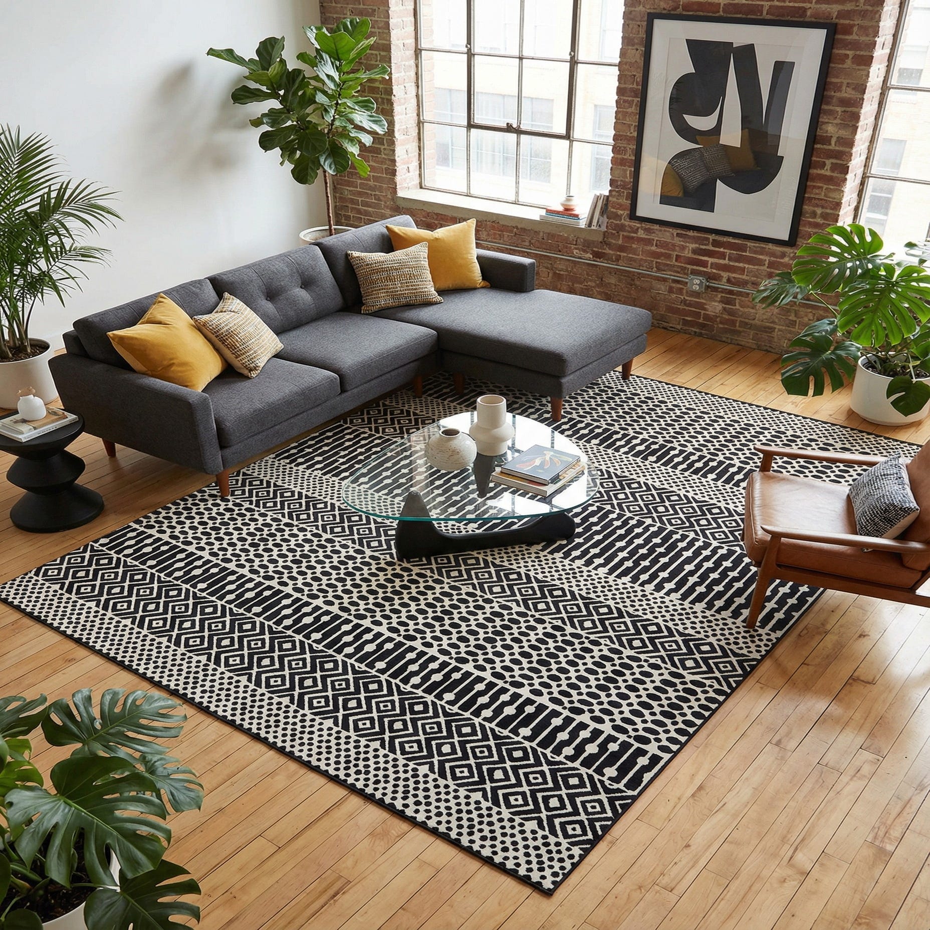 Place it under a simple sofa and coffee table to anchor a contemporary living room, or pair it with a light-wood dining set to add striking contrast to a minimalist dining area. It also works well in a home office or entryway where graphic geometry can serve as a focal point; combine with natural textures, matte metals and mid-century modern pieces to balance the bold pattern.