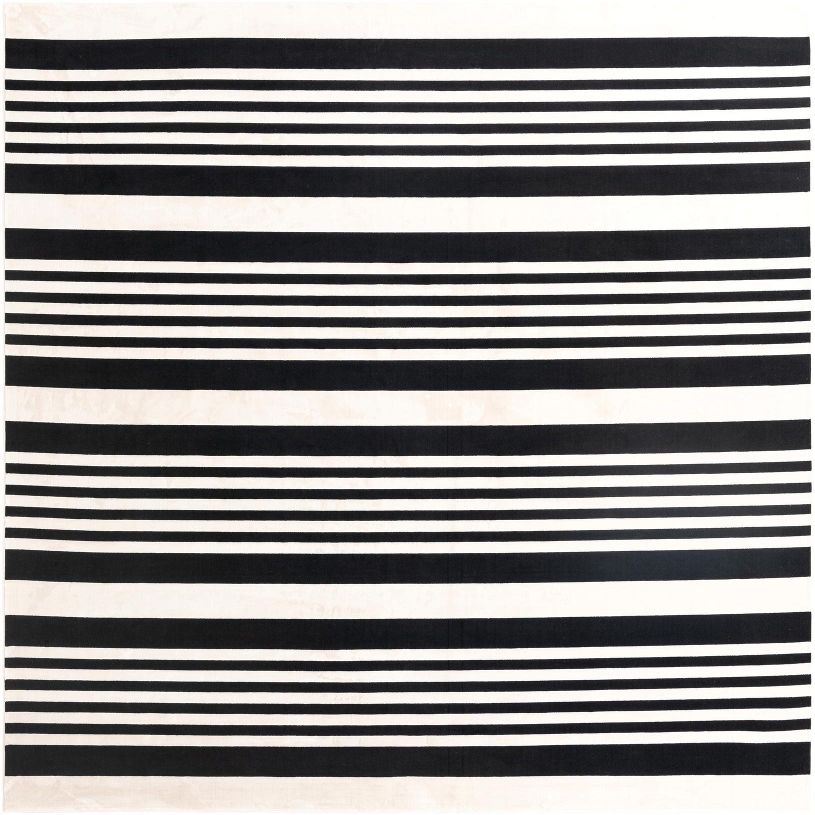 A 10x12 rectangular area rug featuring bold horizontal stripes in varying widths of black and white.