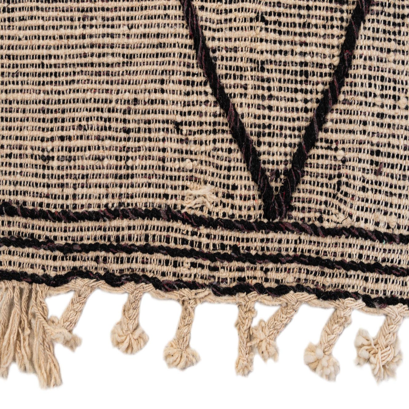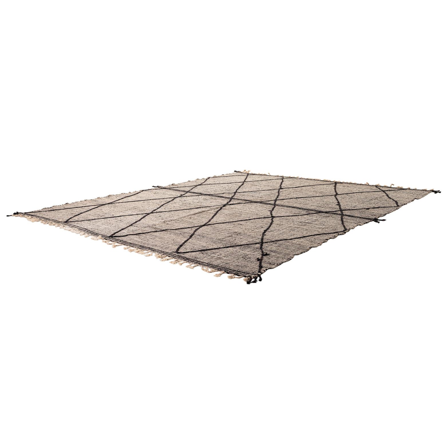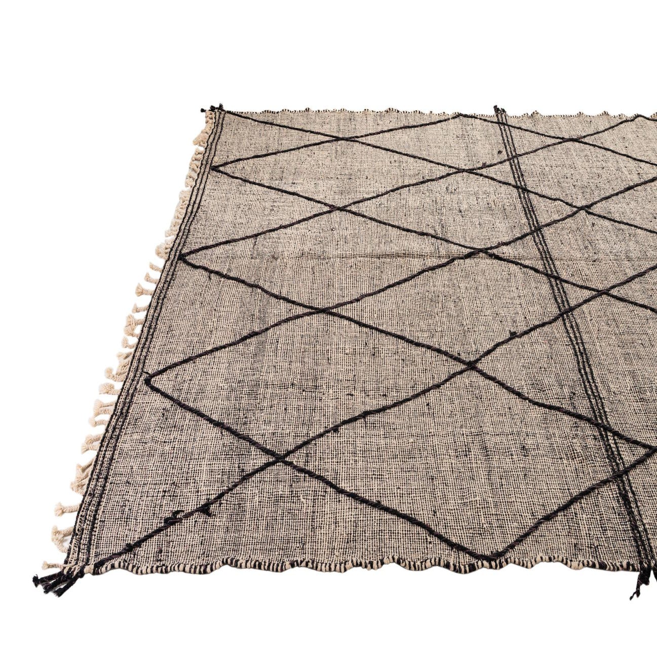 Hand-knotted from 100% wool, this rug has a low, tactile weave with a gently nubby surface you can feel underfoot and along the fringed ends. The design pairs a black-and-white background with warm beige texture, overlaid by an organic black diamond lattice that runs across the field. Irregularities in the handwork and the soft, natural wool pile give the piece visual depth and a comfortably lived-in feel.