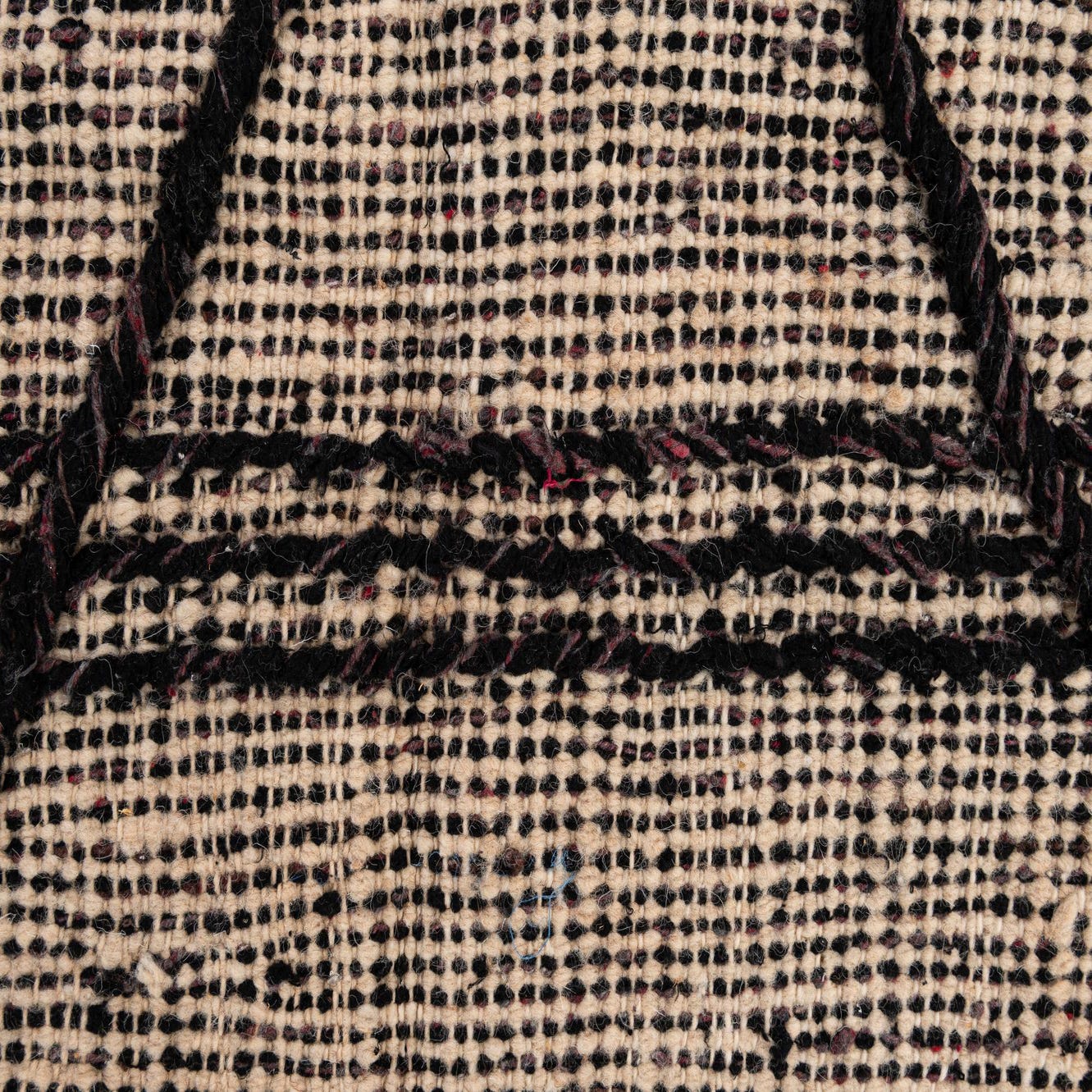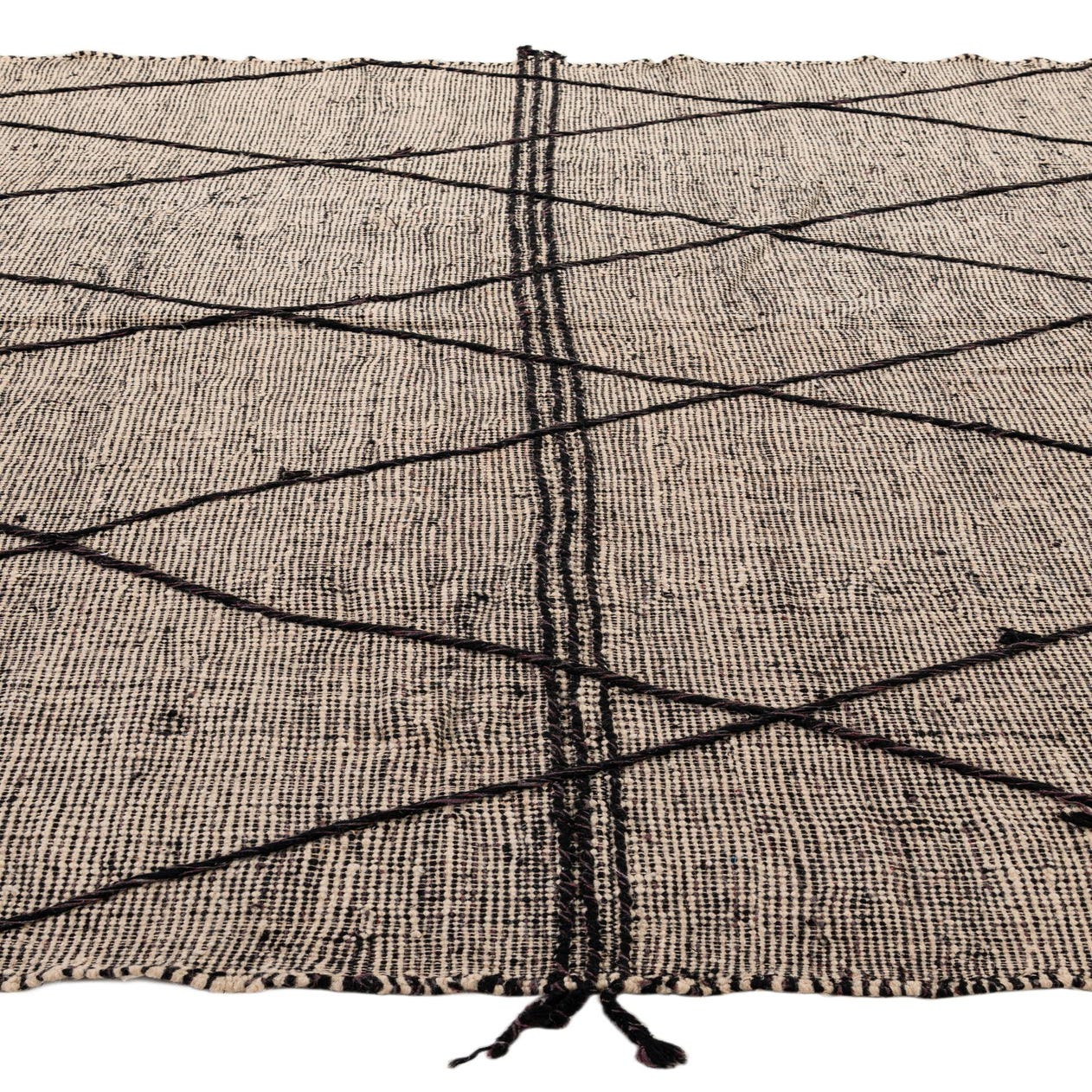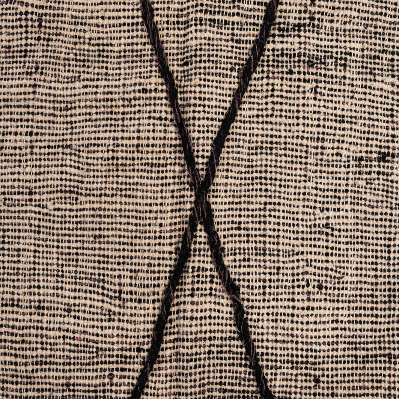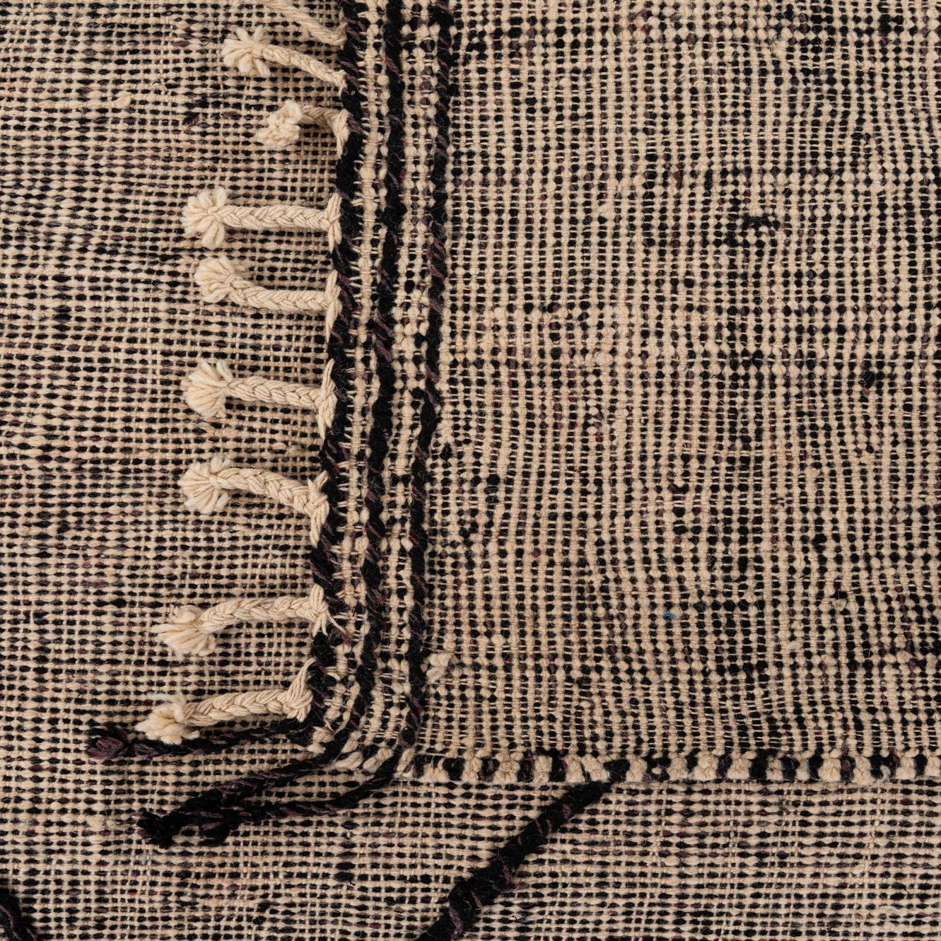 Hand-knotted from 100% wool, this rug has a low, tactile weave with a gently nubby surface you can feel underfoot and along the fringed ends. The design pairs a black-and-white background with warm beige texture, overlaid by an organic black diamond lattice that runs across the field. Irregularities in the handwork and the soft, natural wool pile give the piece visual depth and a comfortably lived-in feel.