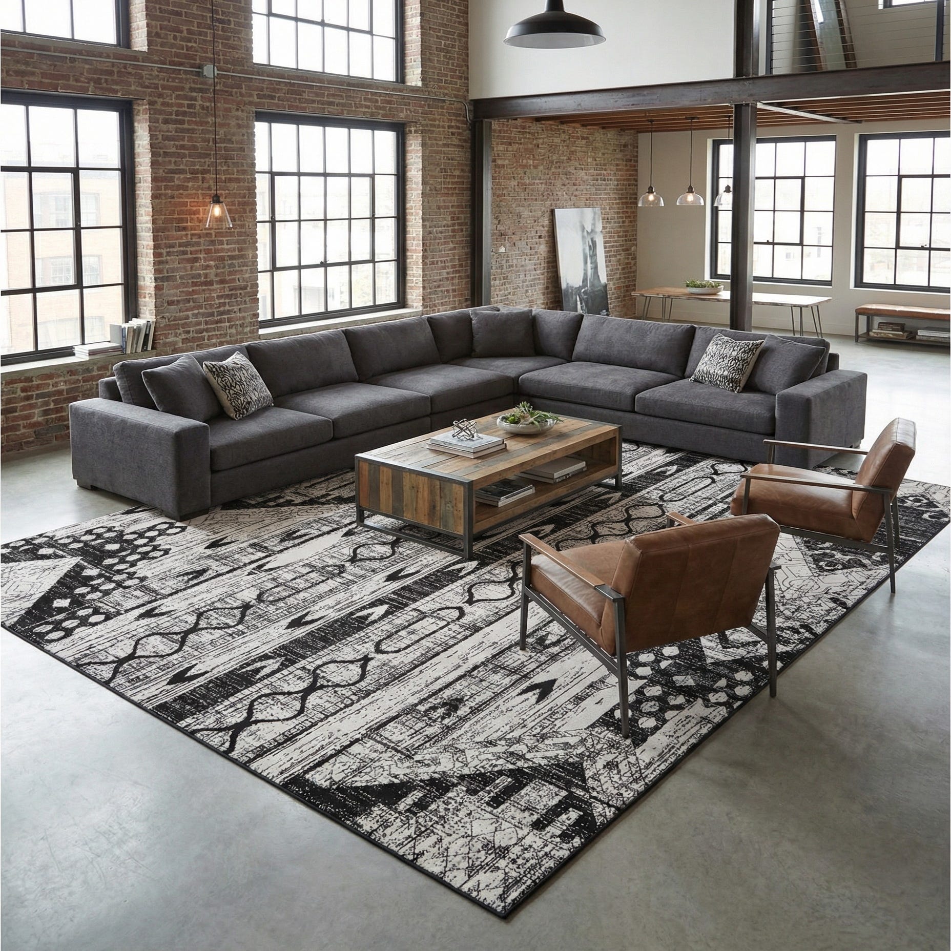 This rug works well as an anchor in contemporary living rooms beneath a sectional, under a large dining table in an open-plan space, or as a focal layer in a loft-style bedroom. Pair it with warm wood and leather for a layered, masculine look, with metal and glass for a minimalist modern scheme, or use it to add pattern to a neutral Scandinavian or industrial interior.