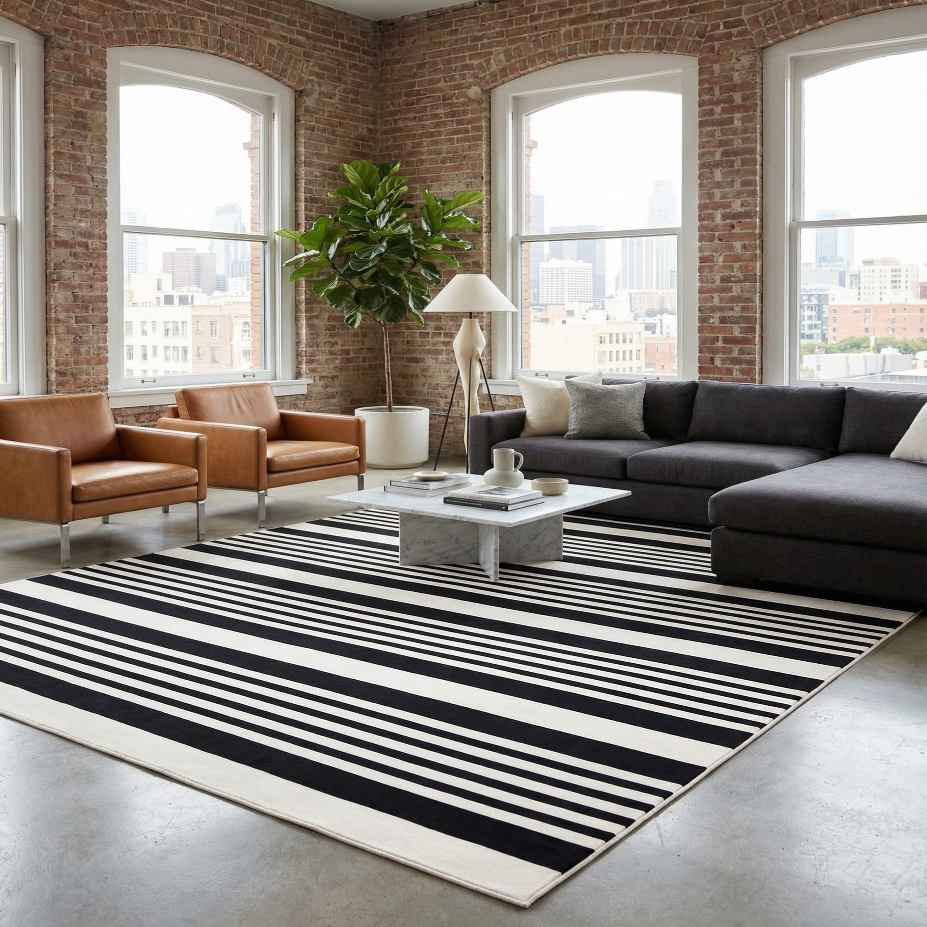 Machine made from 100% polyester, the rug has a low, smooth pile with a subtle sheen that feels soft underfoot and keeps the striped pattern sharply defined. Use it to anchor a streamlined living room seating area, ground a dining table beneath simple chairs, or introduce graphic interest to a home office. It pairs nicely with light wood tones, metal accents, and monochrome or neutral furnishings, and can be layered with textured textiles to balance the rug’s clean, linear aesthetic.