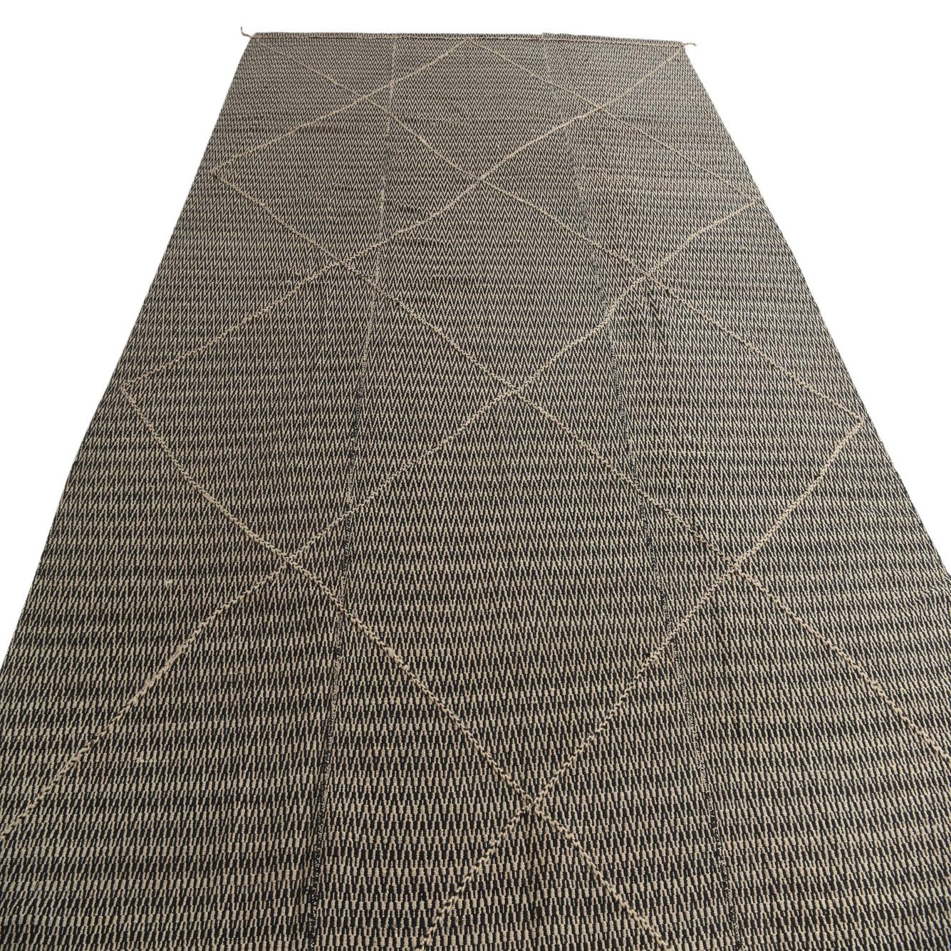 This Moroccan collection rug is hand-knotted of 100% wool and measures 10x14 feet. It features a bold black and white color scheme that creates a striking visual contrast. The rug's pattern consists of intersecting diagonal lines forming a series of large, diamond-shaped motifs across its surface. The texture is characteristic of high-quality wool, offering a natural softness underfoot and a pleasing tactile experience.