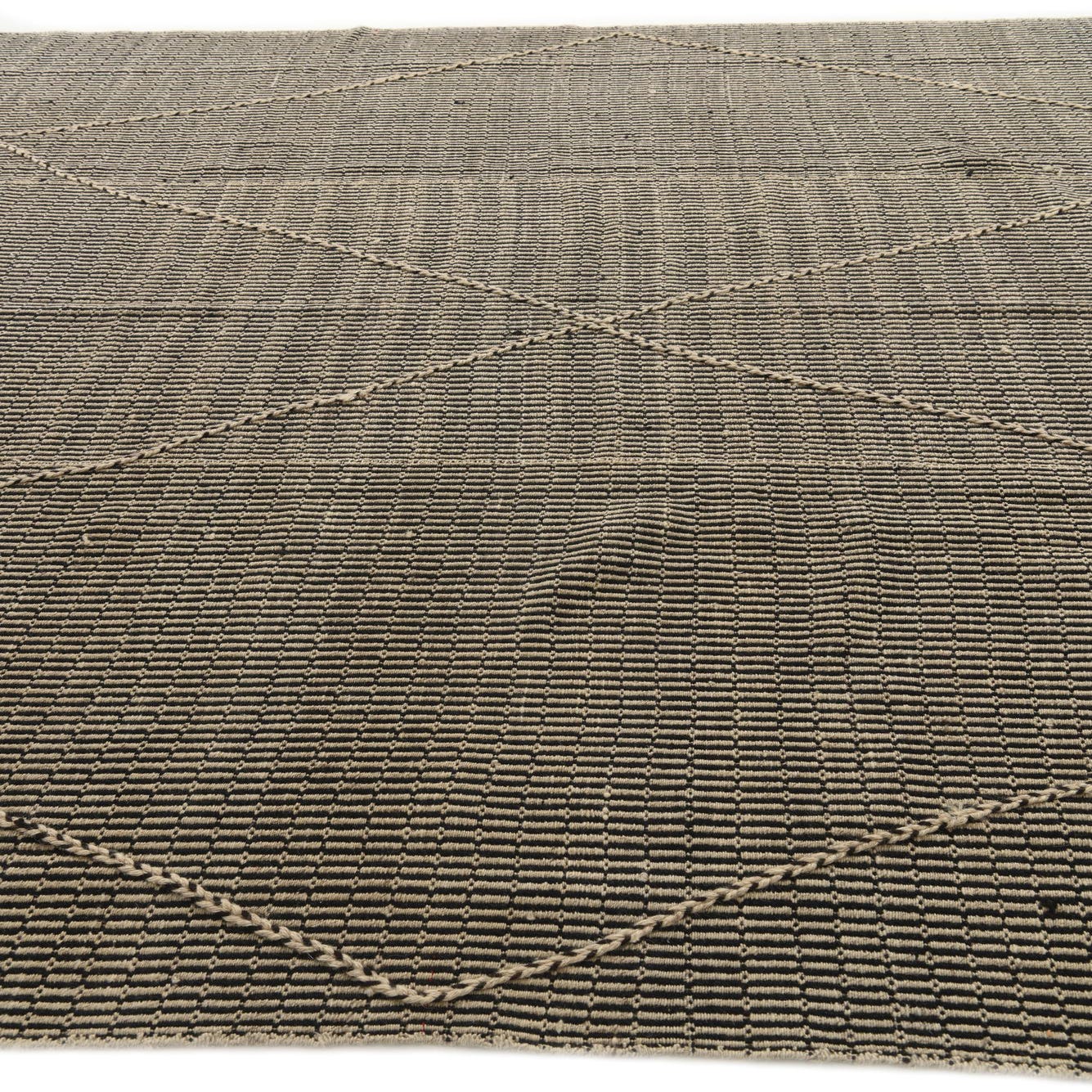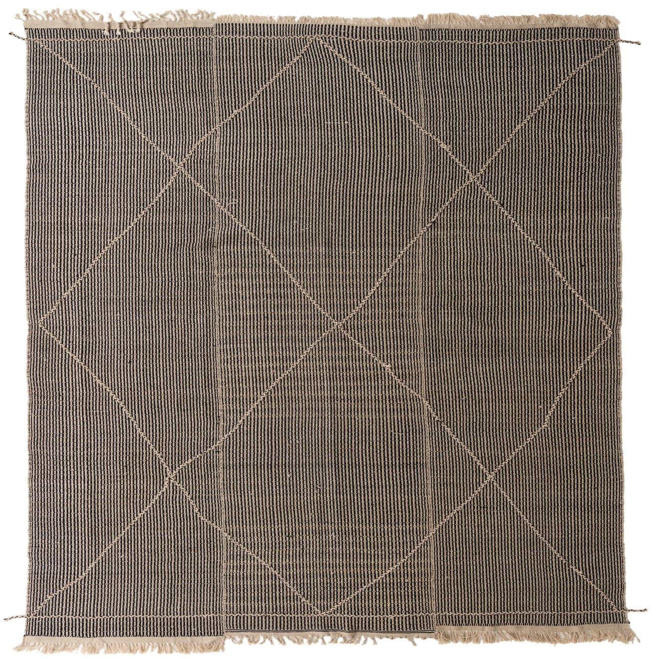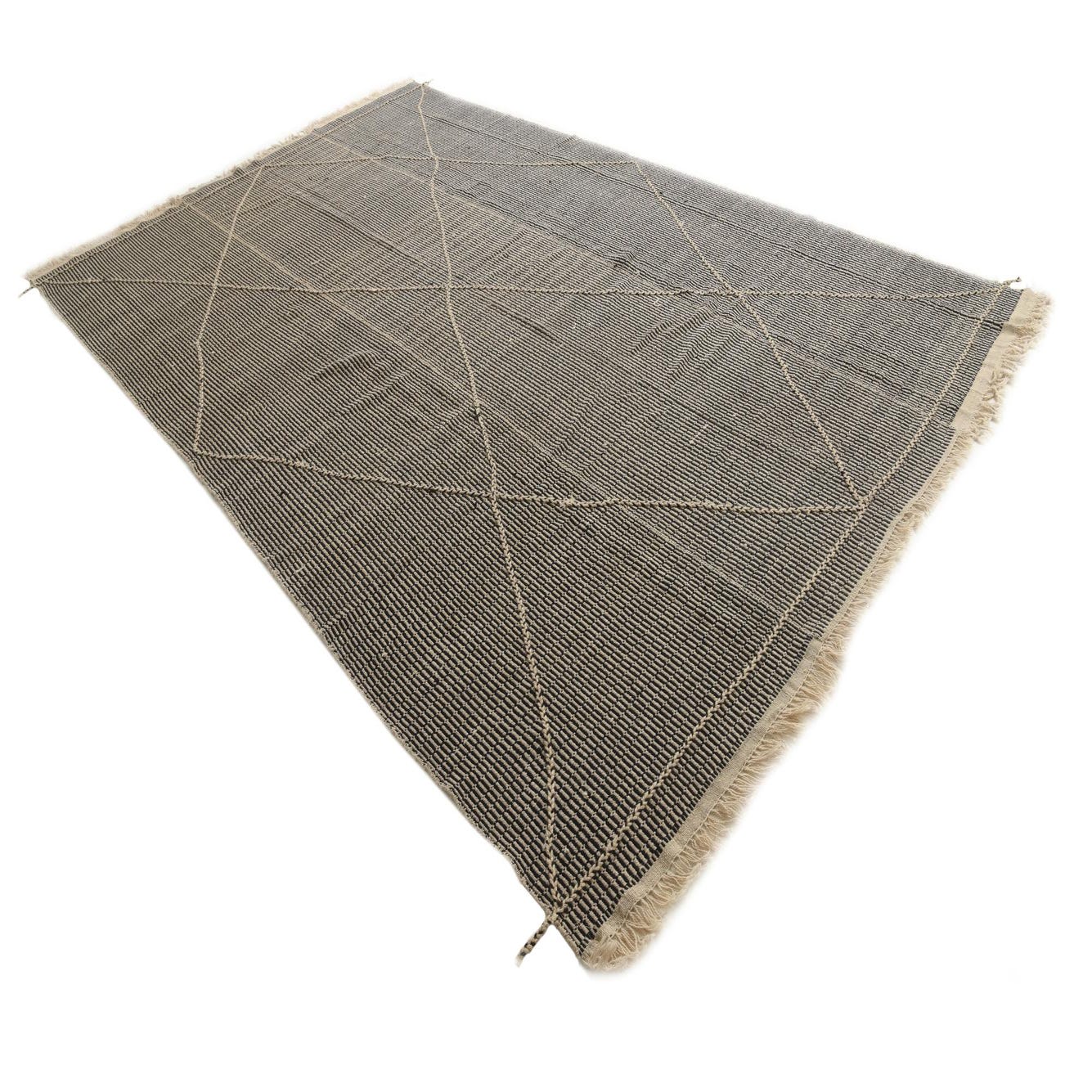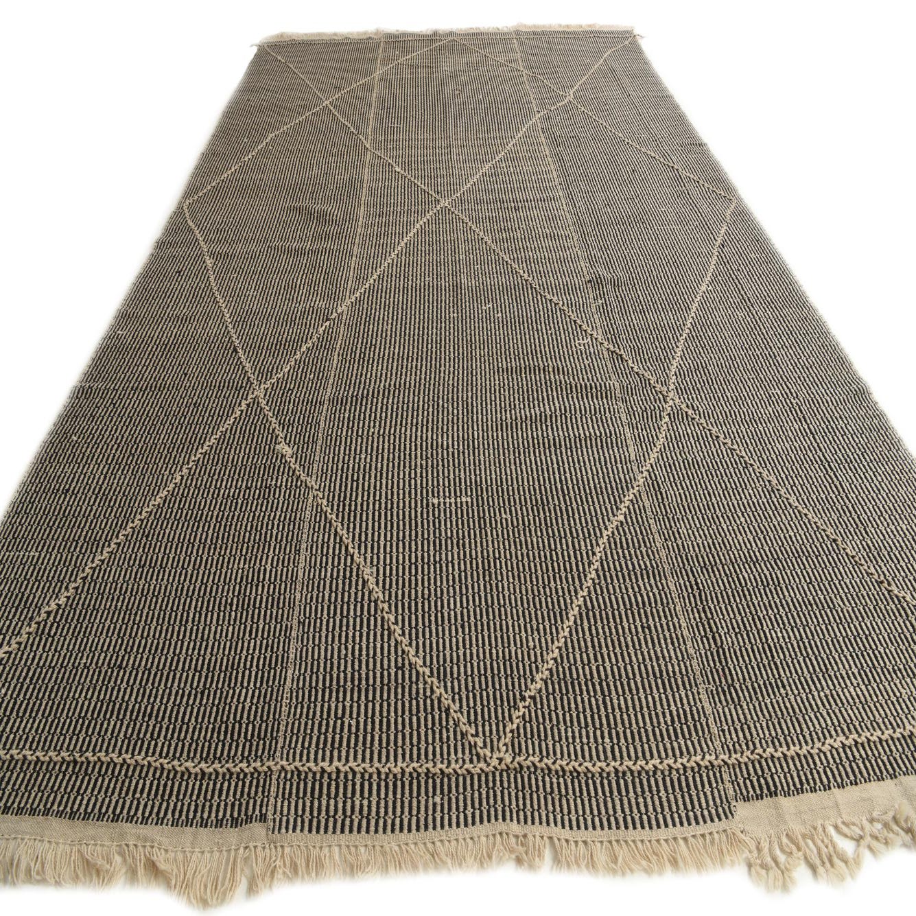 The rug's sizable dimensions make it well-suited for spacious interiors, where it can serve as a grounding element in a living room, dining area, or open-plan space. Thanks to its neutral color palette, it offers versatility—complementing both minimalist, modern aesthetics, and more eclectic decor styles. The rug's fringe adds a traditional finishing touch that enhances its authentic handcrafted appeal.