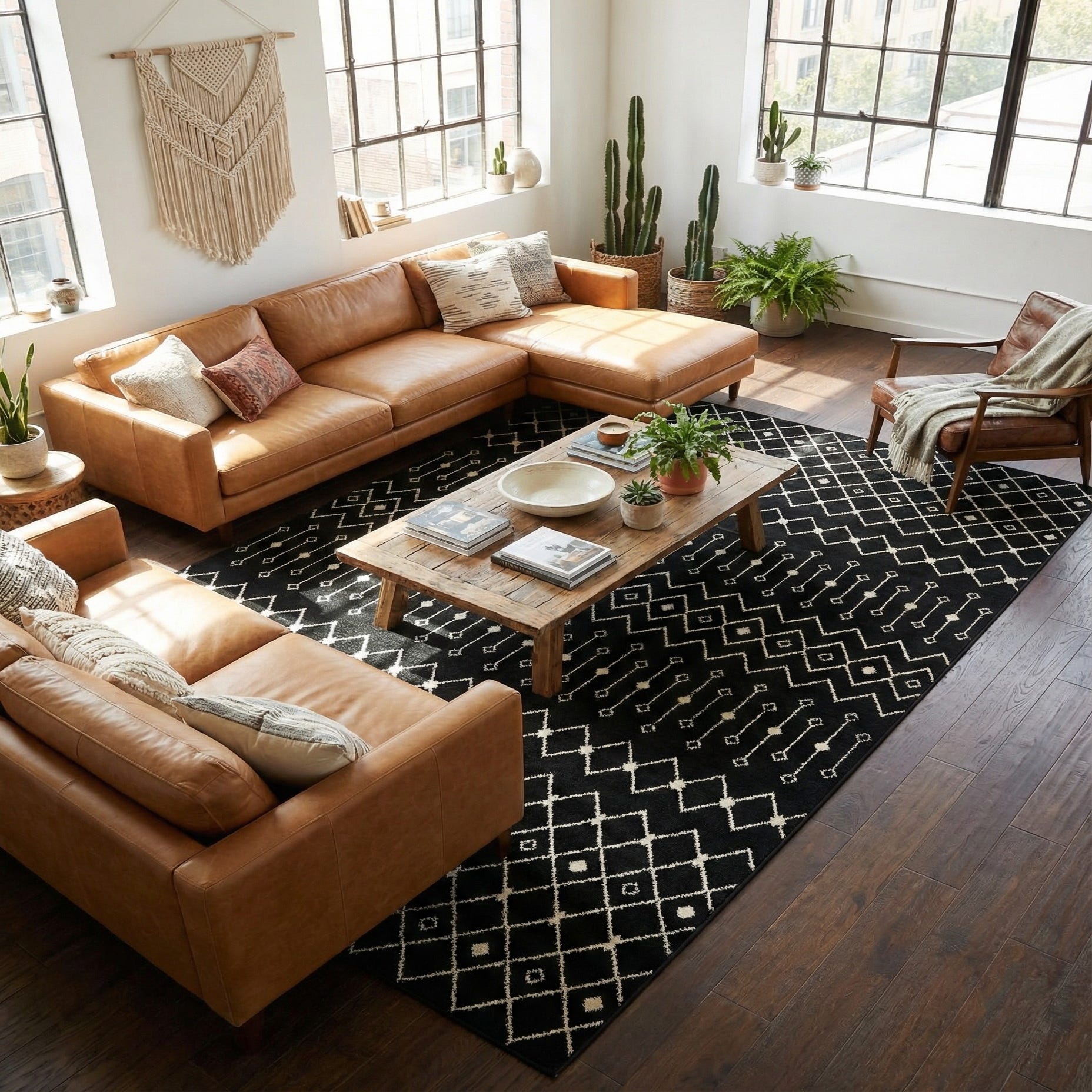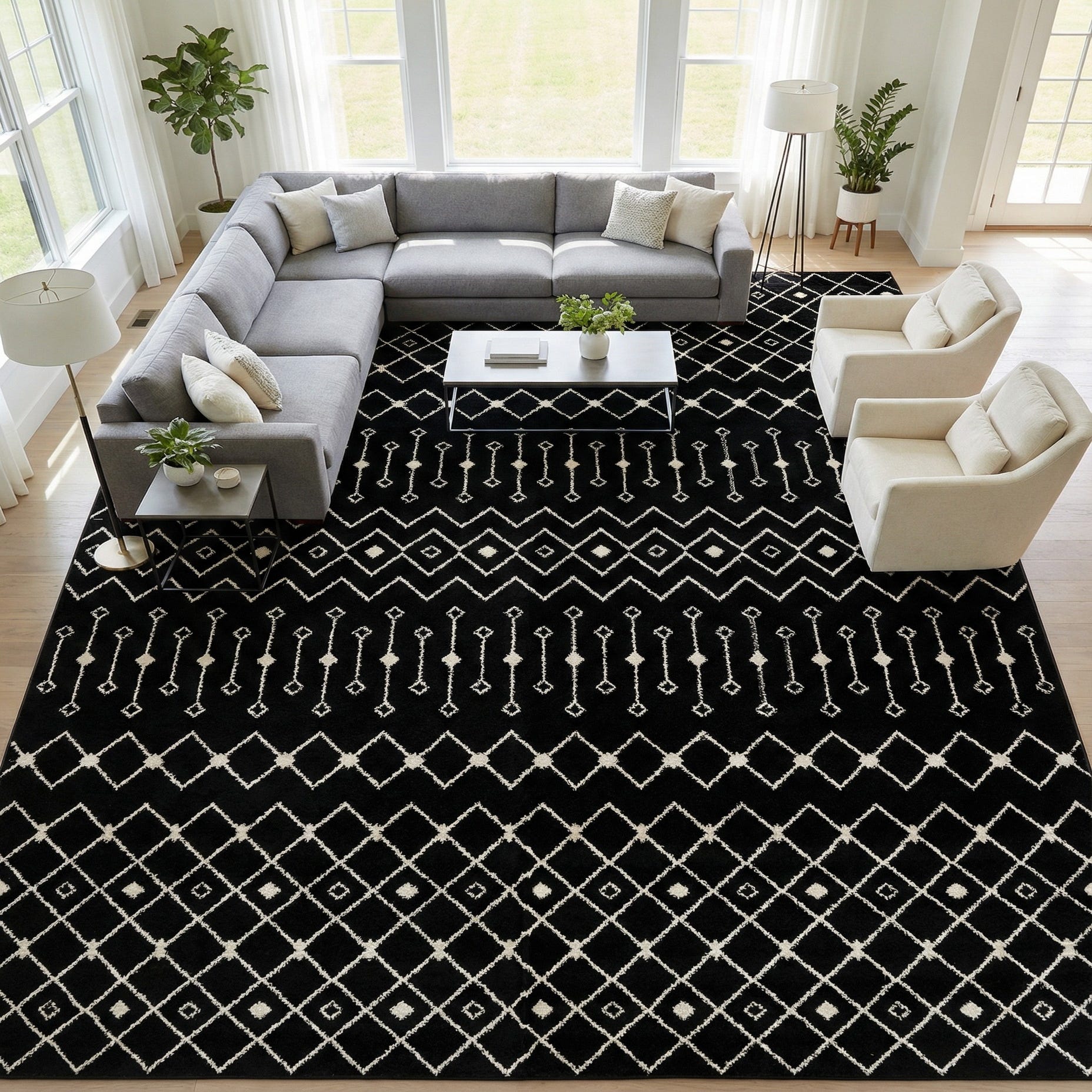 Place it where contrast and pattern can anchor the room: beneath a linen sofa in a contemporary living room, under a large dining table to add structure to an open-plan space, or layered in a minimalist bedroom to bring texture without extra color. It pairs well with monochrome palettes, warm wood tones, and mixed-metal accents, and complements styles from modern and mid-century to transitional and global-inspired interiors.