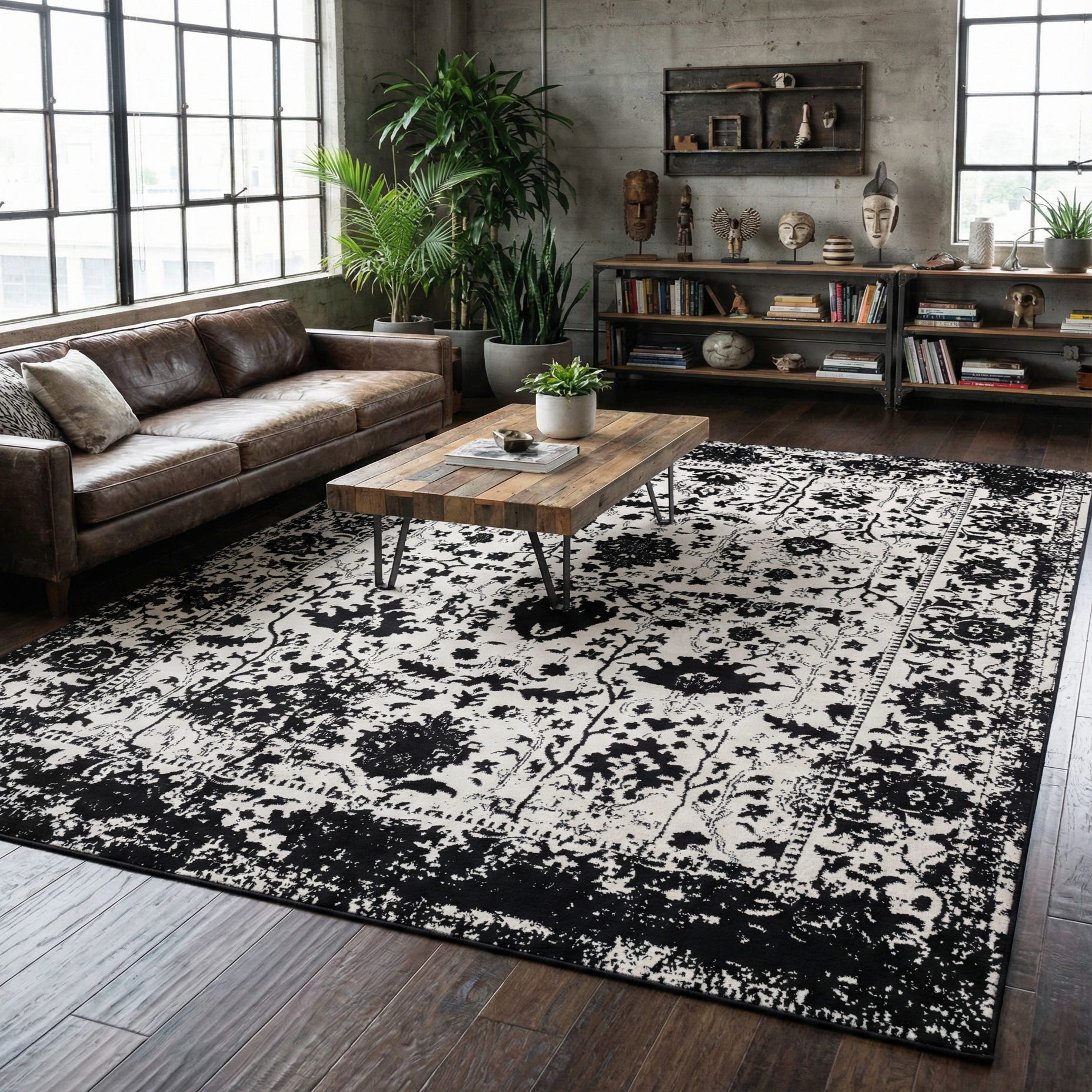A black-and-white palette gives this rug a striking yet restrained look, with classic Persian-inspired motifs—medallions, floral vines and scrolling accents—rendered in a deliberately distressed pattern. The worn-border effect and scattered ink-like marks soften the formal layout, creating movement and a relaxed vintage character. Run your hand across the low, machine-made pile and you'll notice a smooth, slightly textured surface where the printed pattern sits crisply against the lighter ground.