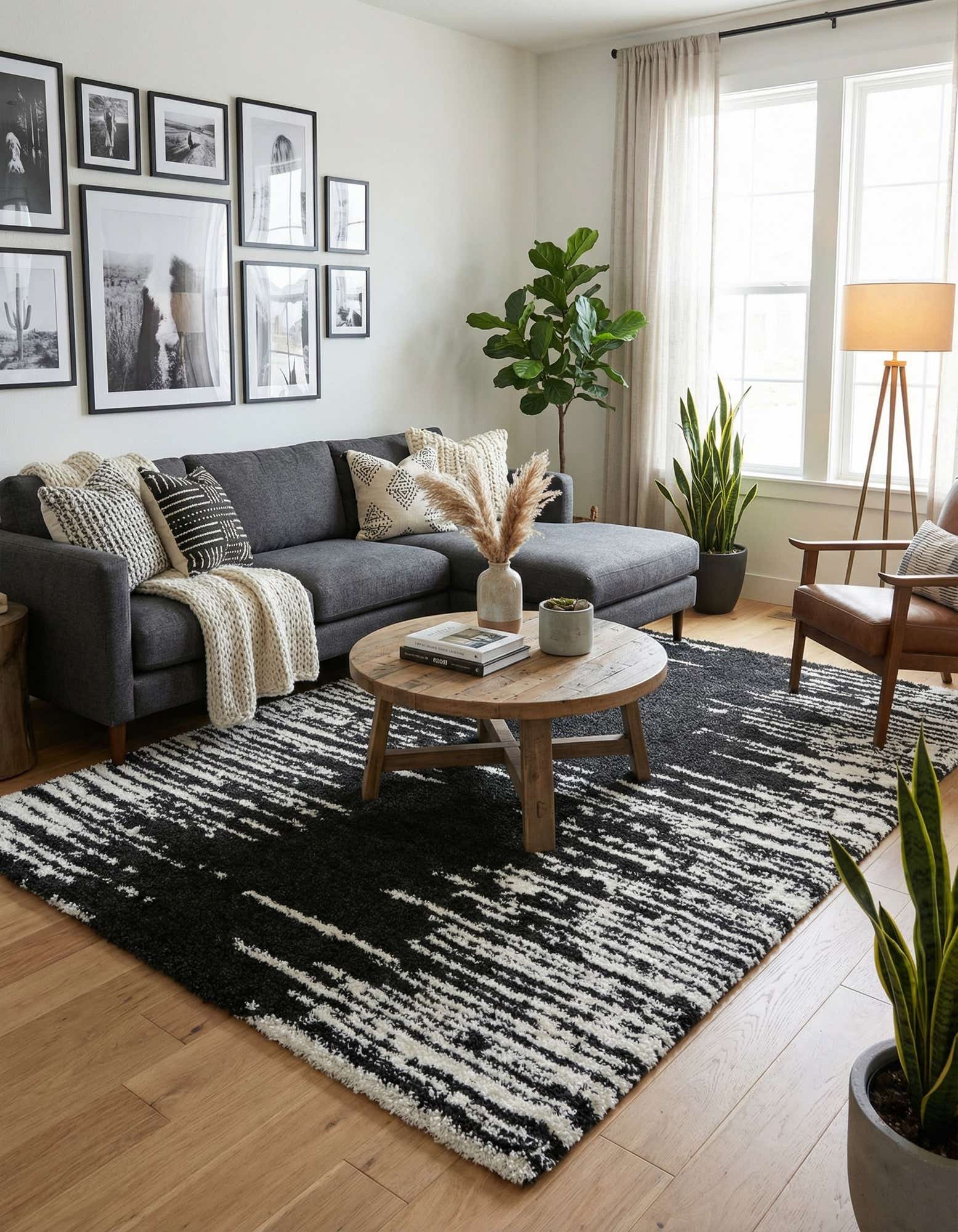 The stark black and white color scheme allows for versatile styling options—it can serve as a statement piece in a minimalist setting, grounding a space with its graphic intensity, or it can act as a neutral backdrop in a more eclectic decor, letting the room's colors and patterns take center stage. Whether placed in a modern urban loft, a casual living room, or a chic office space, the Serenity Shag rug's bold design and plush comfort create a welcoming and stylish atmosphere.