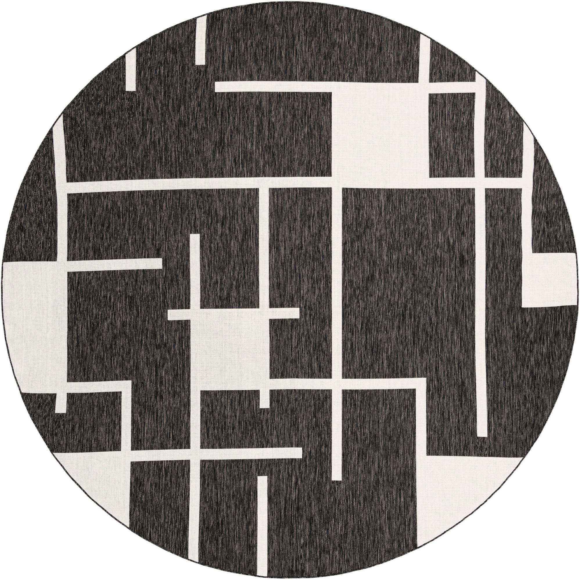 A 12' round black and white modern geometric rug with a flatweave texture, suitable for indoor or outdoor use.