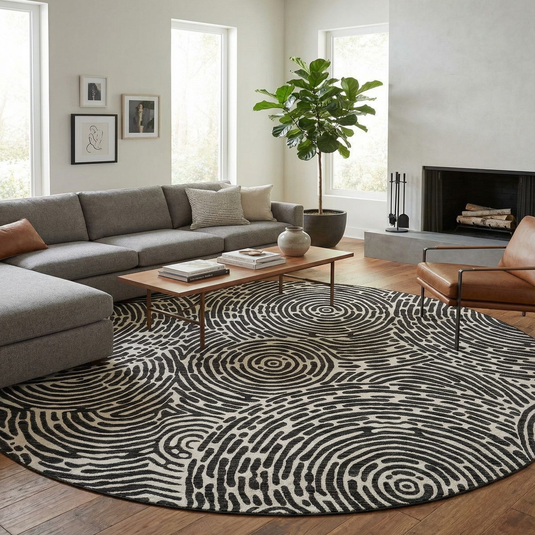 A 12' round black and white modern abstract rug with a fingerprint-like pattern, suitable for indoor or outdoor use.