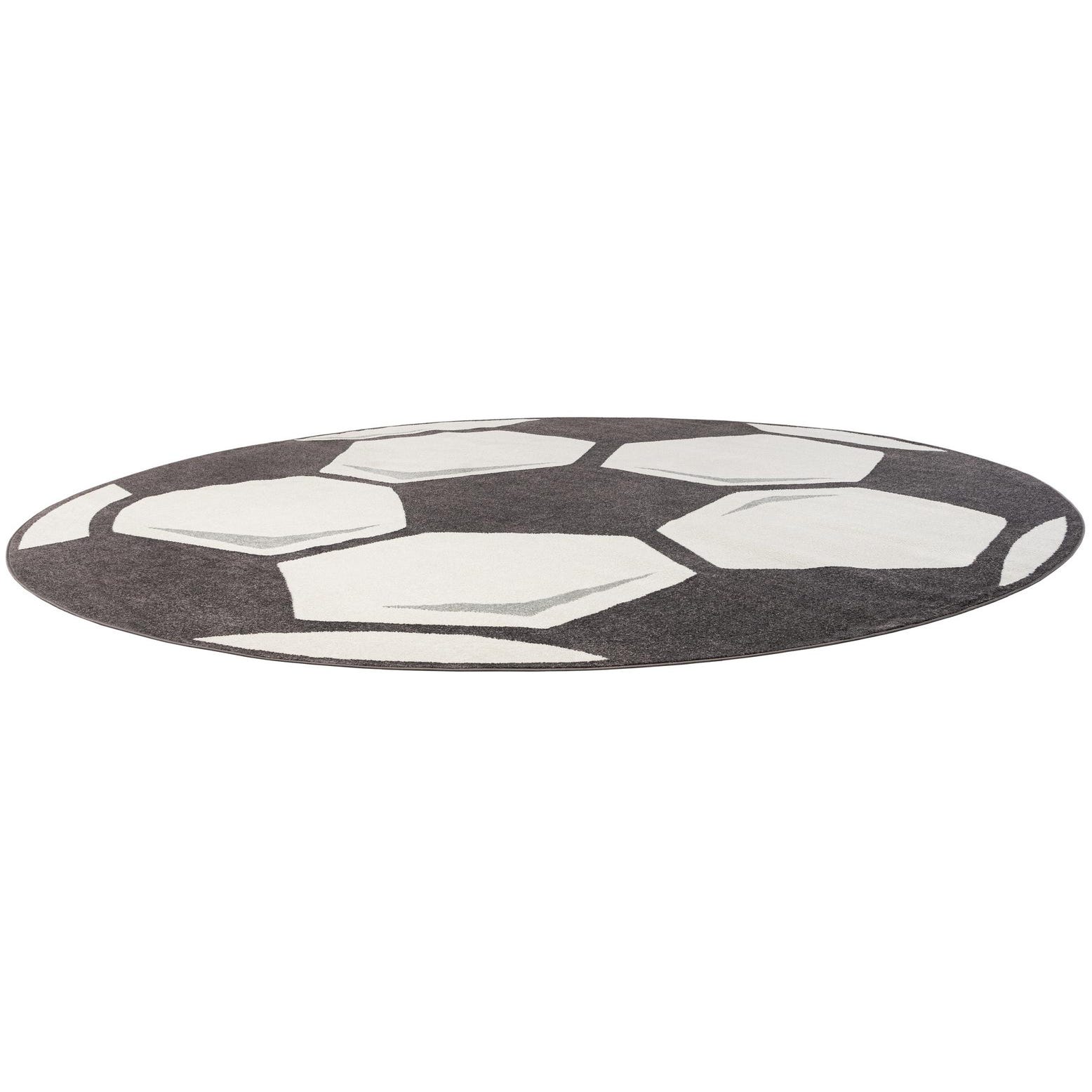 A bold, graphic soccer-ball motif fills the round silhouette with crisp white pentagons set against a deep black field and soft gray shadowing for dimension. The design has a playful, sporty character that works naturally in children's spaces and casual family areas, while the round shape creates a defined play surface or focal point in an open room.