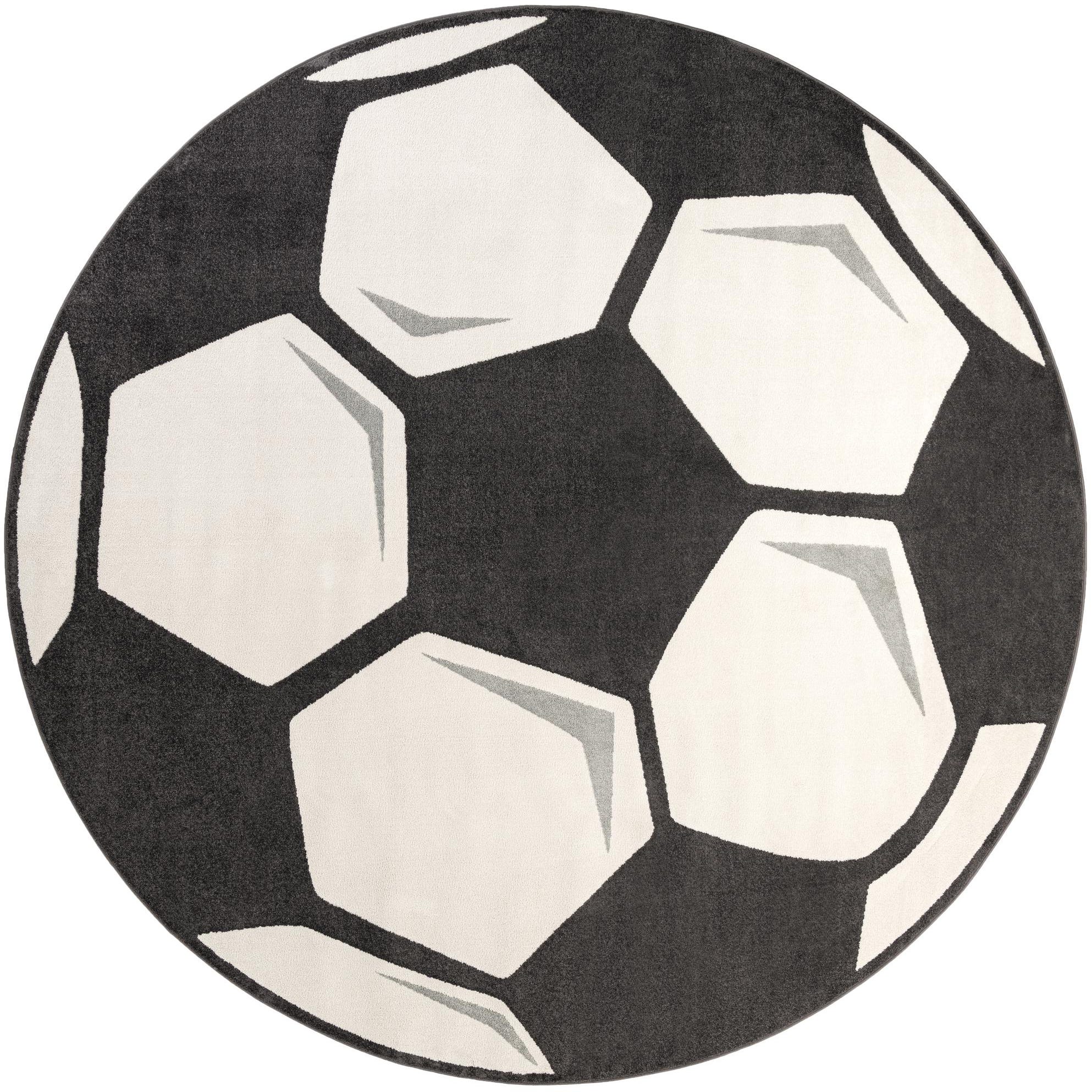 A bold, graphic soccer-ball motif fills the round silhouette with crisp white pentagons set against a deep black field and soft gray shadowing for dimension. The design has a playful, sporty character that works naturally in children's spaces and casual family areas, while the round shape creates a defined play surface or focal point in an open room.