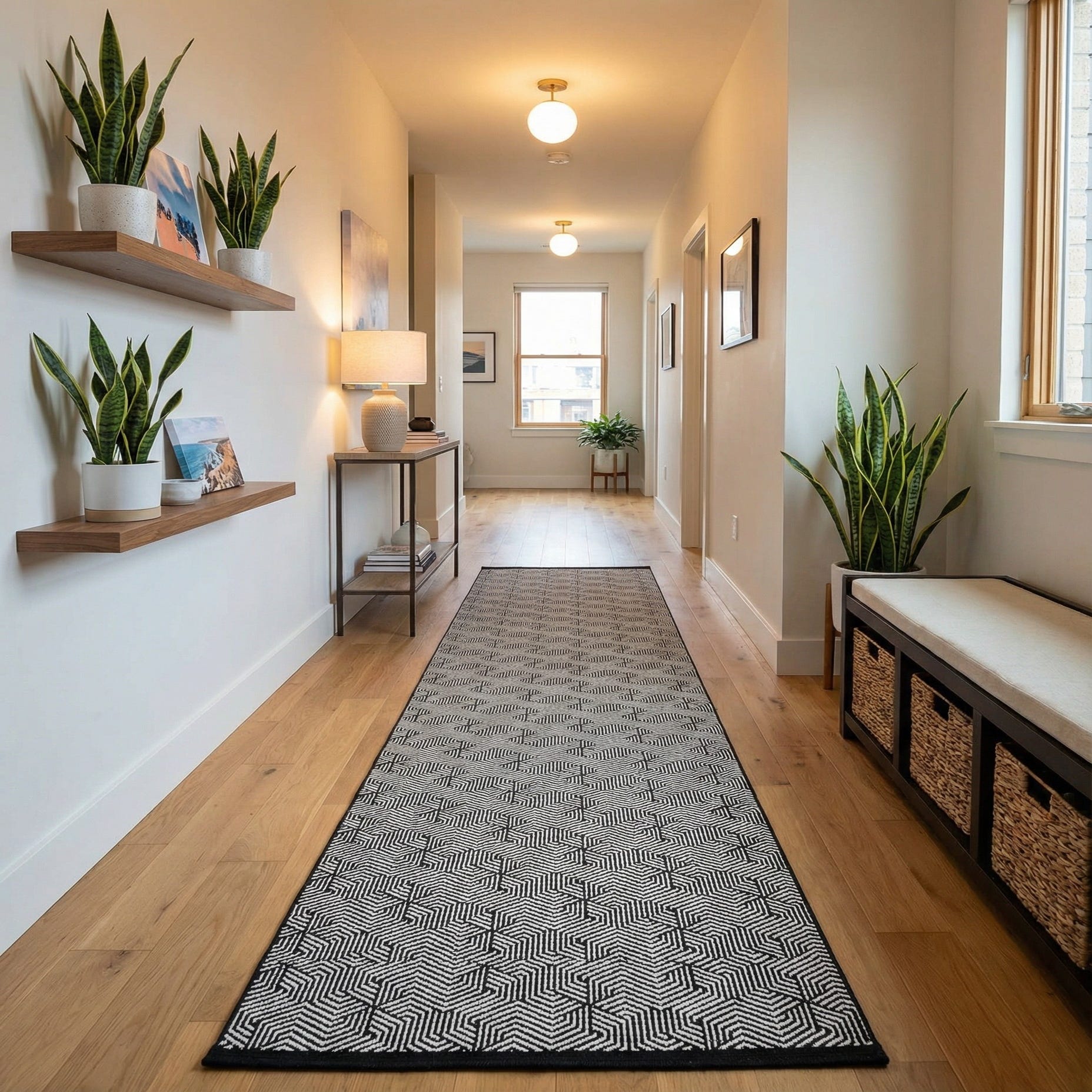 Place this runner in a hallway, entry, or along a galley kitchen to introduce striking linear interest without overwhelming the space. It complements monochrome, modern minimalist, Scandinavian, and mid-century schemes as well as industrial or urban loft interiors, pairing especially well with light wood flooring, metal accents, or leather seating. Use it to anchor a console table, guide circulation through a narrow corridor, or layer over a larger neutral rug to add graphic contrast and rhythm to an open-plan layout.