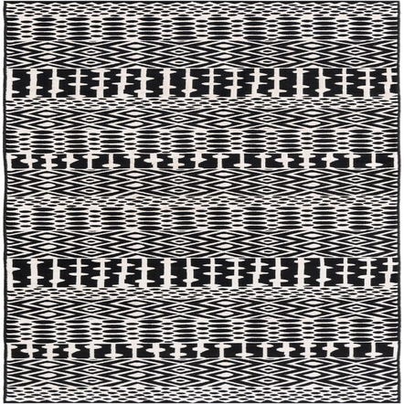 A 12 ft black and white runner rug with alternating geometric patterns, including diamonds, polka dots, and abstract lines.