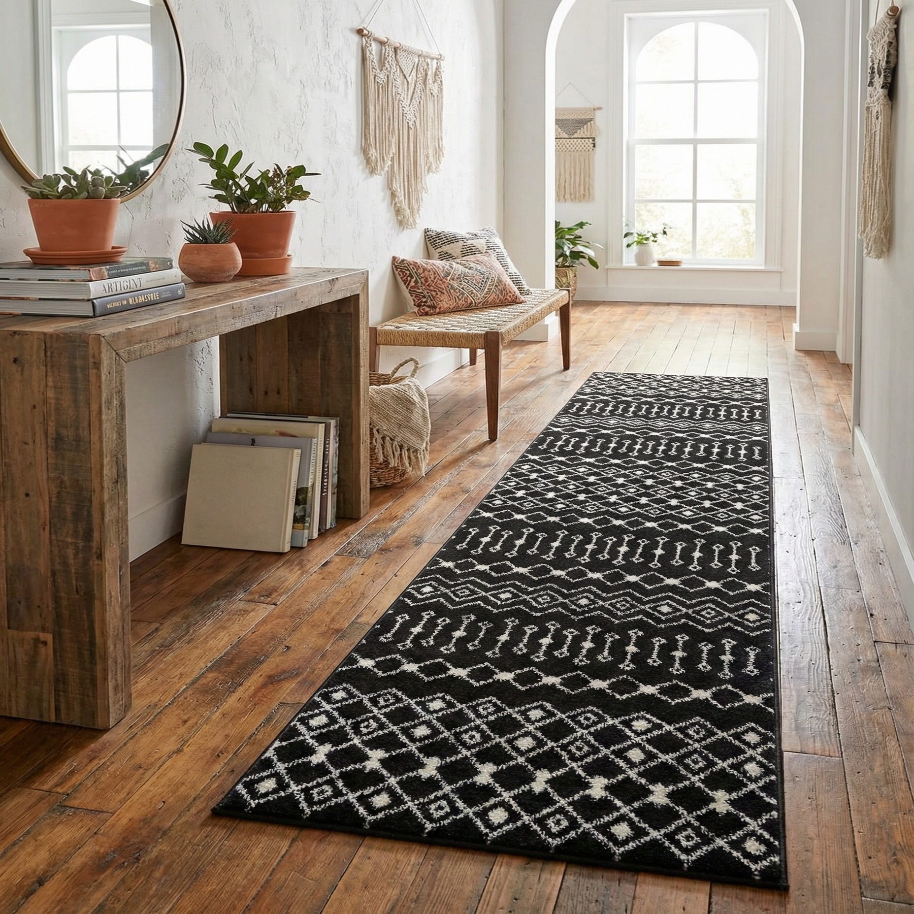 Ideal for long, narrow spaces, this piece anchors hallways, entries and kitchen aisles while bringing structured contrast to a room. Pair it with light wood floors and warm metal accents for a modern vibe, layer it in a bohemian hallway alongside woven baskets and greenery, or use it to ground a monochrome living space with pops of color like teal or mustard. Its graphic, versatile palette works well in minimalist, mid-century and industrial interiors where crisp geometry complements furniture and architectural details.