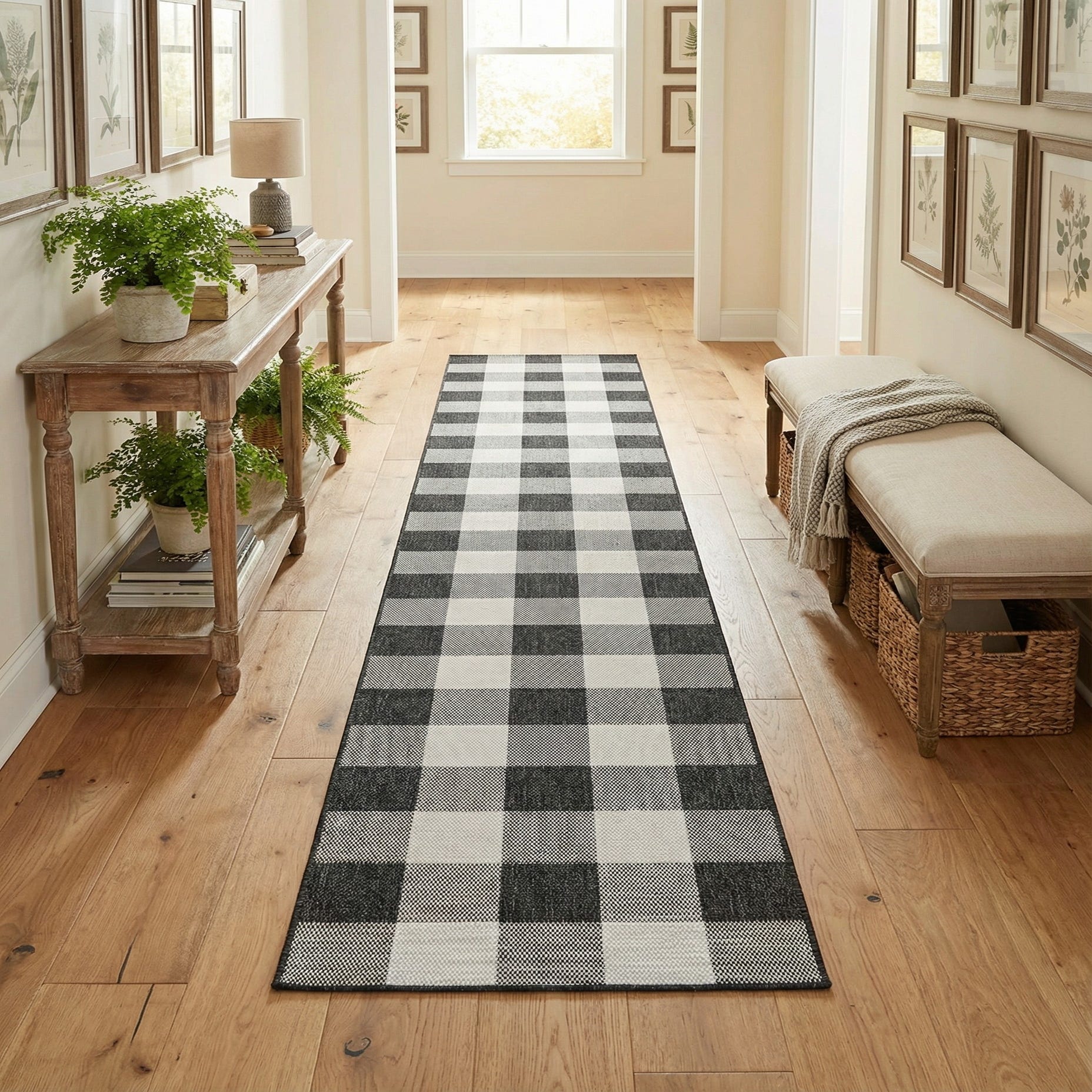 A 12 ft runner rug featuring a bold black and white checkered pattern, ideal for a modern hallway or outdoor patio.