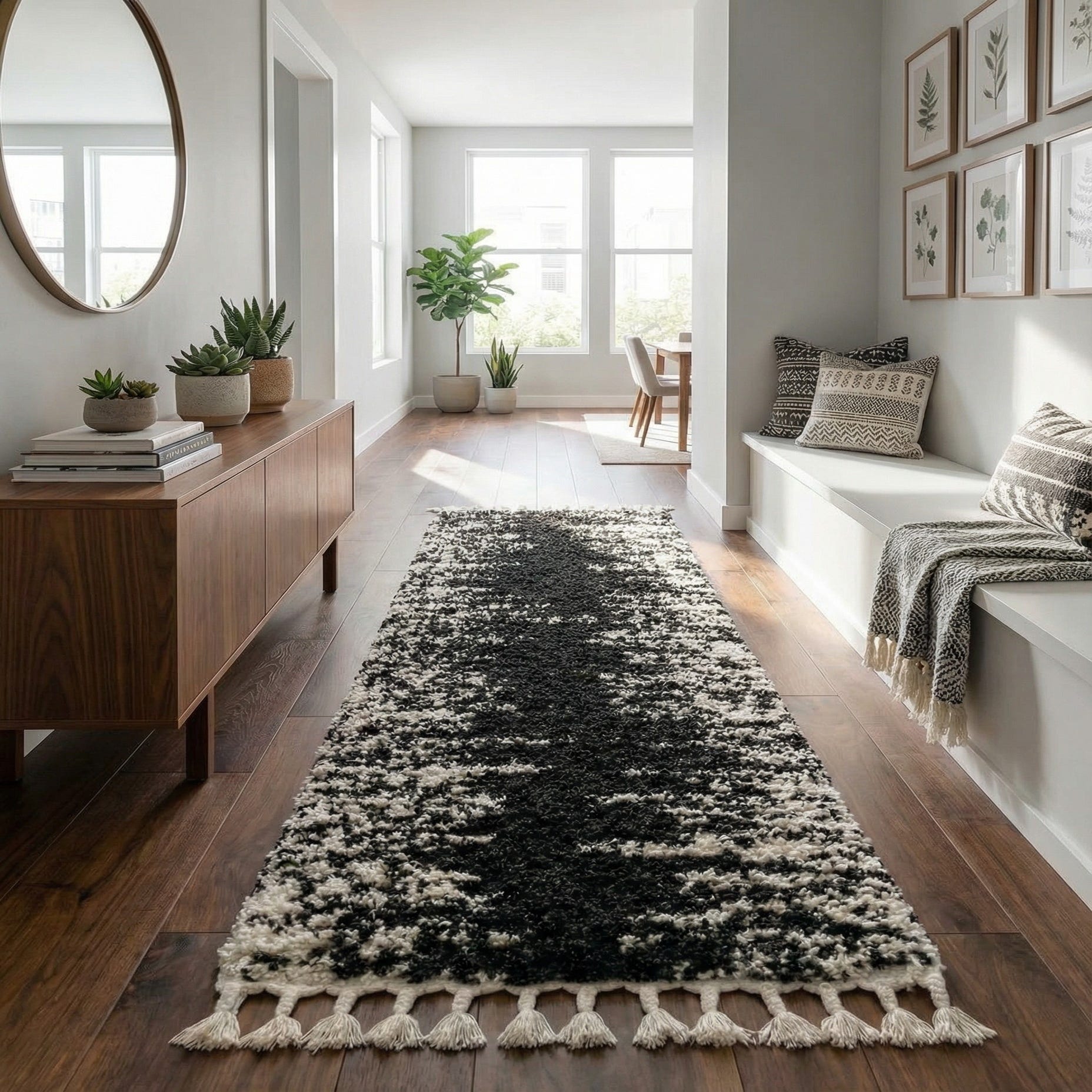A 12 ft runner rug from the Serenity Shag collection, featuring a textured black and white abstract pattern with a central black stripe and white tassels.