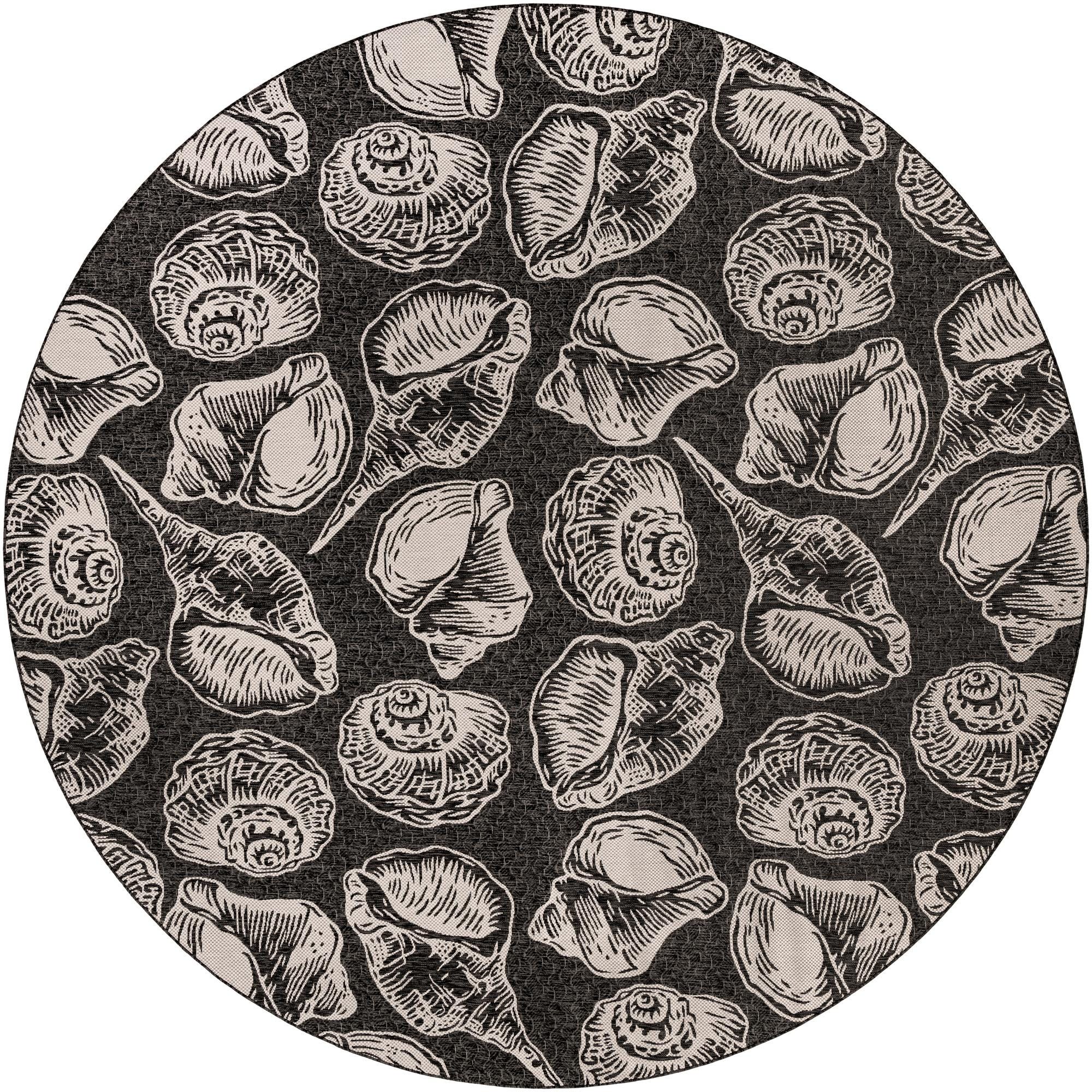 A round 13' black and white indoor/outdoor rug featuring a modern beach/nautical pattern of various seashells.