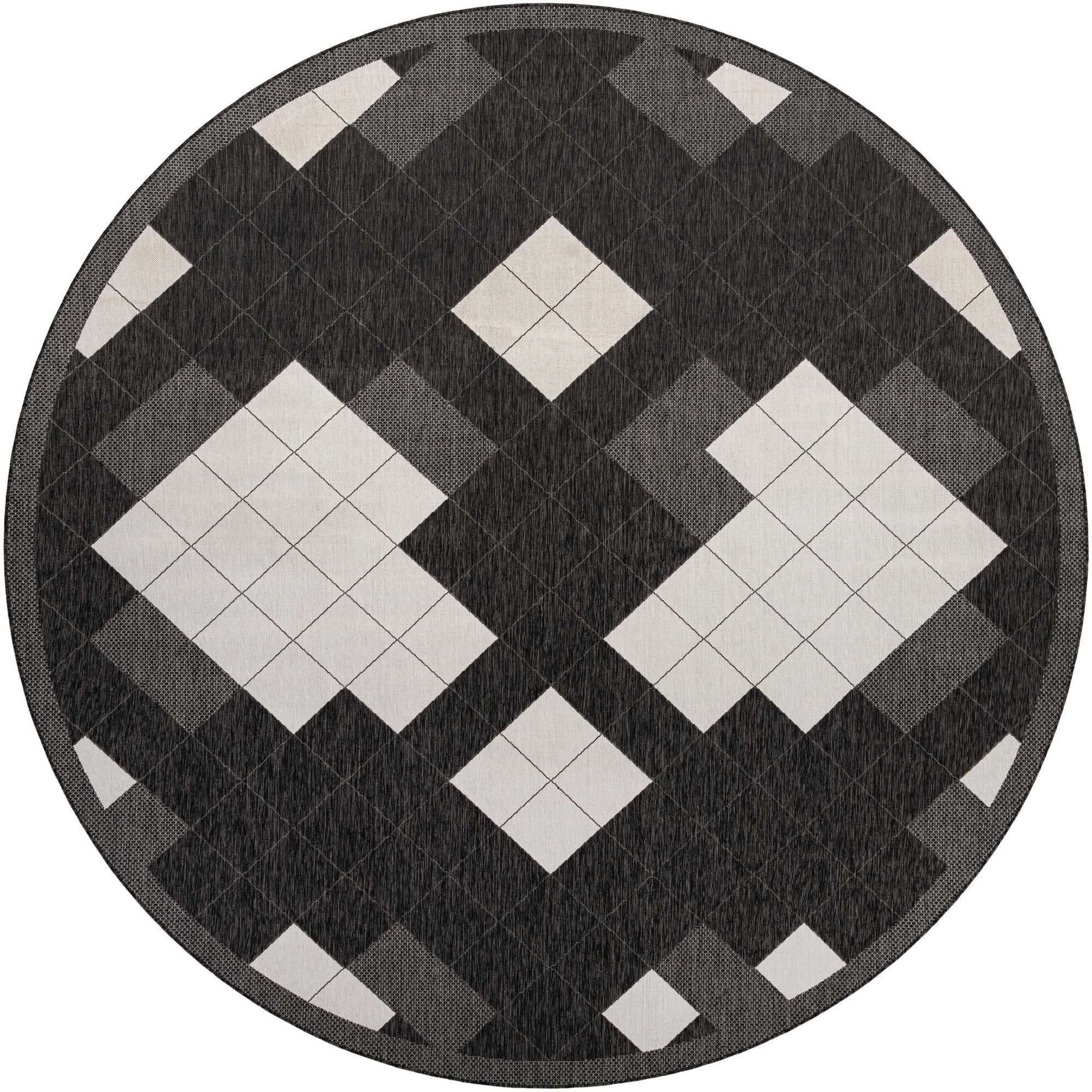 A large round black and ivory modern rug with a geometric argyle pattern, suitable for indoor or outdoor use.