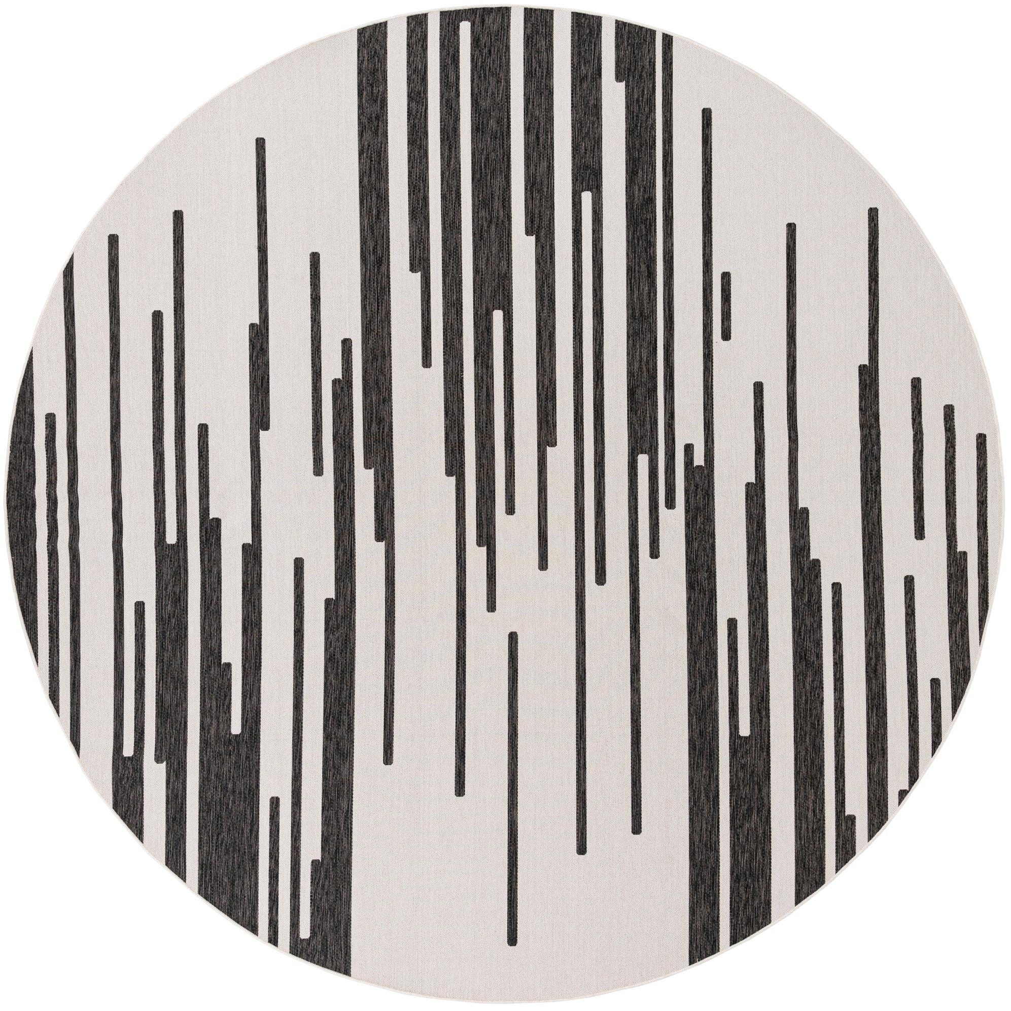 A 13-foot round Rugs.com Outdoor Modern rug with a black and white abstract linear pattern, ideal for a patio.