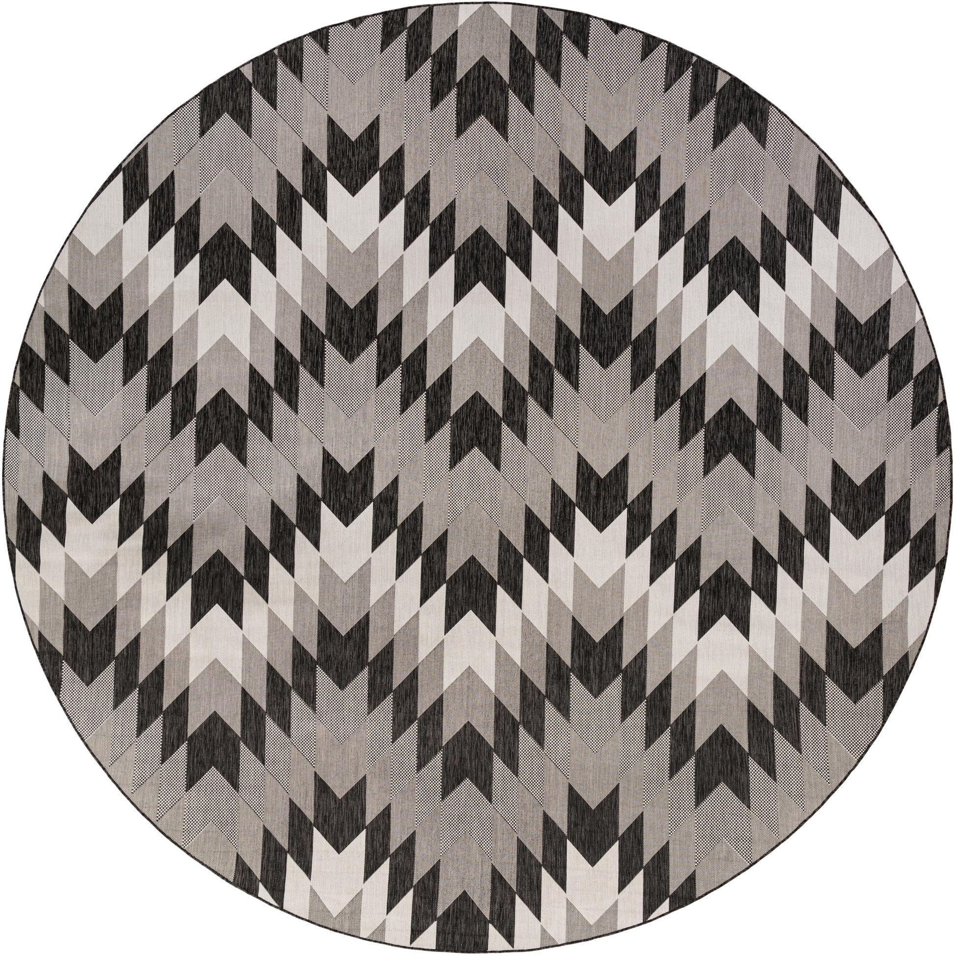 Rugs.com Outdoor Modern 13' round rug with a geometric chevron pattern in shades of black, white, and gray.