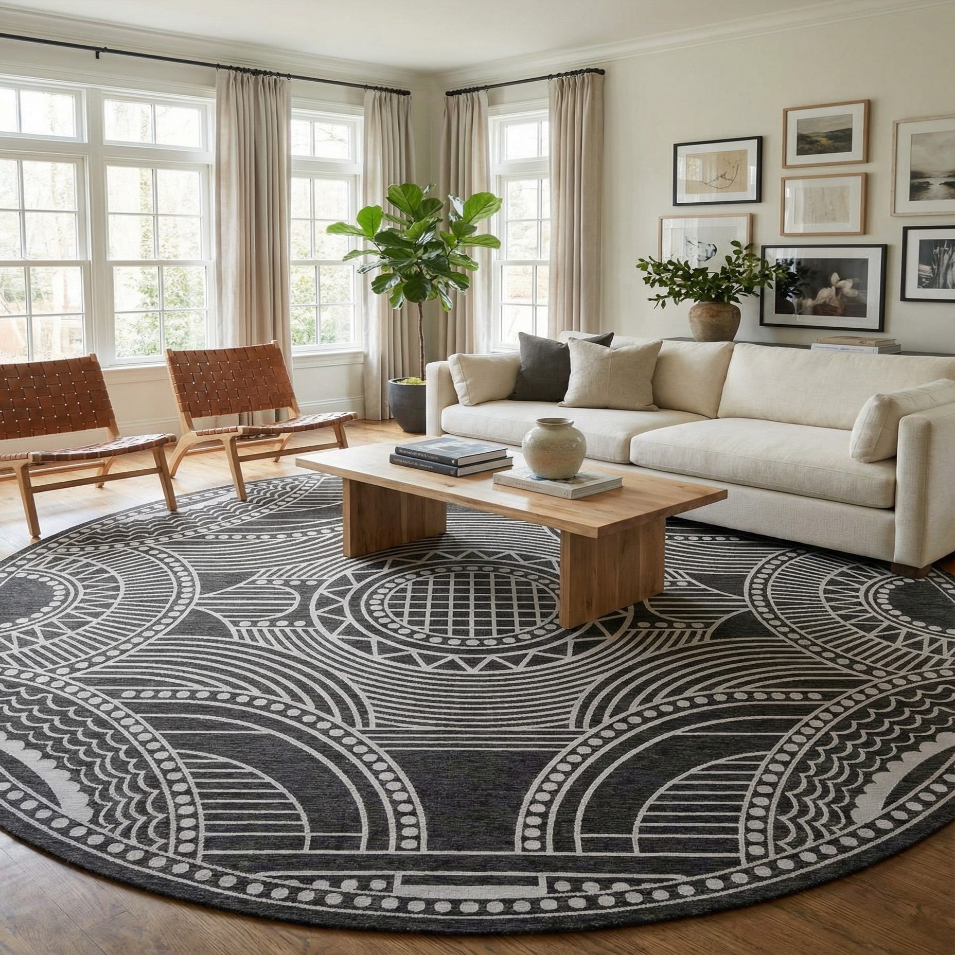 Use this round rug to anchor a covered patio dining set or to define an outdoor seating area; it also makes a confident statement in a sunroom, entryway, or modern living room. Pair it with matte black or brushed-metal furnishings and warm wood tones for a balanced, contemporary look, or soften the geometry with woven cushions, linen throws and plenty of greenery to introduce texture and warmth.