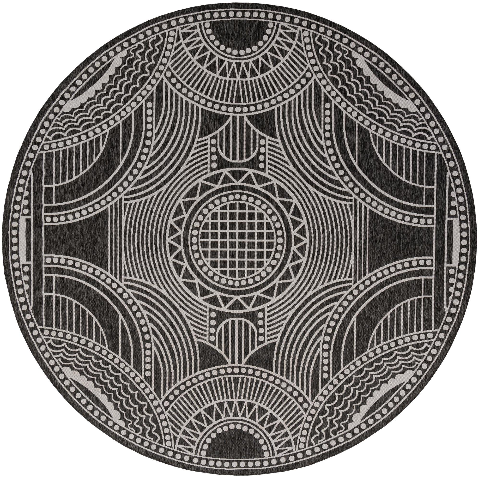 Bold, graphic medallions and concentric arches form a structured, art deco–inspired pattern across this round rug. A central lattice motif is framed by bands of scallops, dots and precise linear stripes, creating a rhythmic, symmetrical composition that reads crisp and architectural. The high-contrast black ground with clean white patterning gives strong visual definition, while the machine-made construction in 100% polypropylene produces a low-profile, tightly woven surface with a smooth but slightly textured hand underfoot.