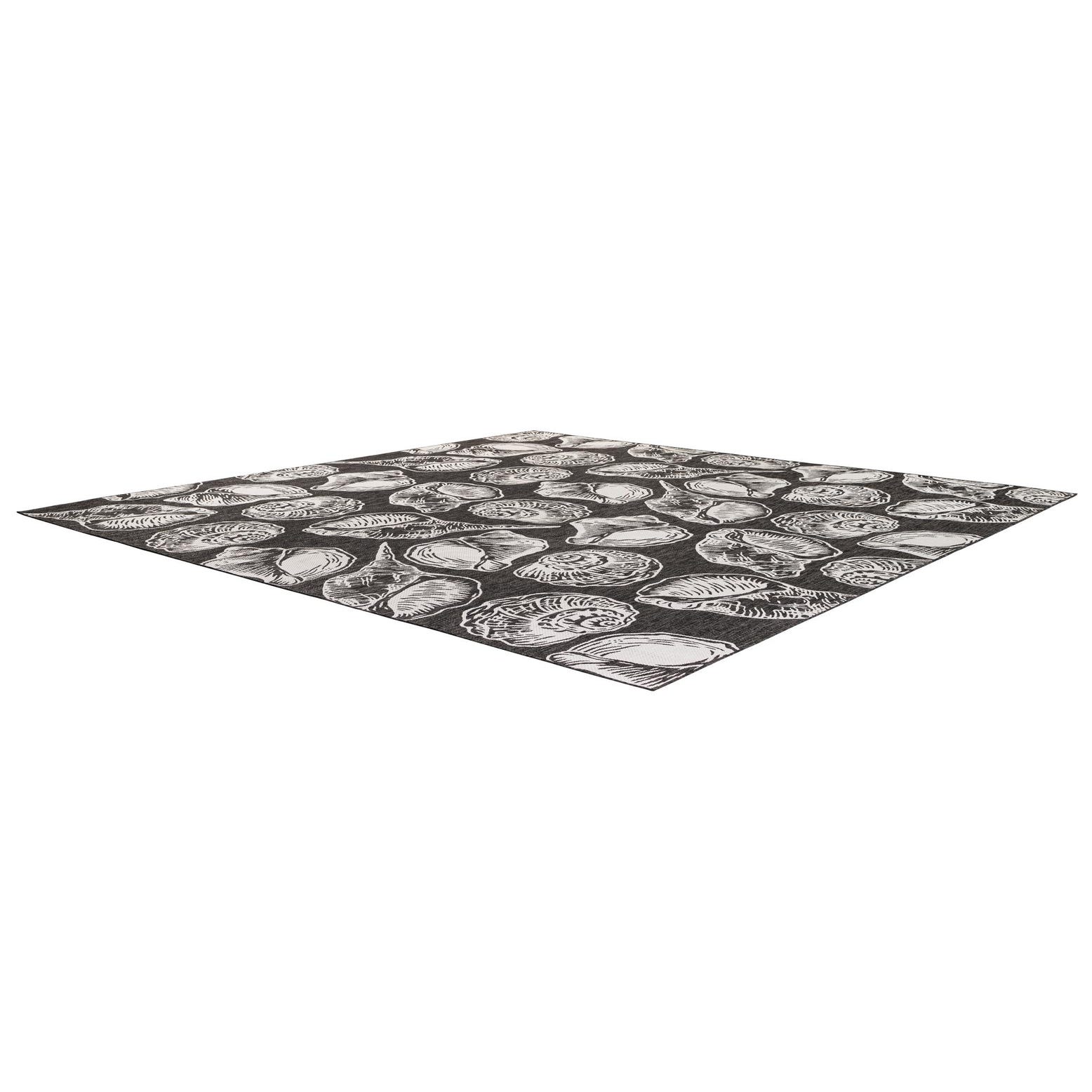 A square black and white outdoor rug featuring a repeating pattern of various seashells, perfect for a patio.