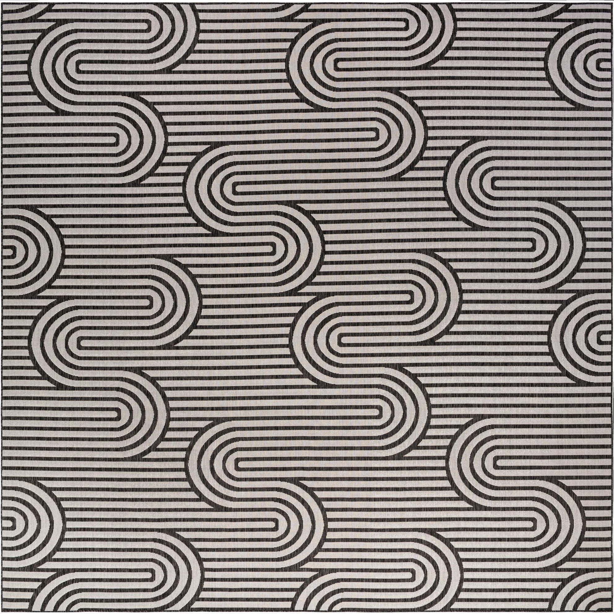 A 13' square Rugs.com Outdoor Modern rug featuring a bold black and white abstract wavy stripe pattern, suitable for a patio.